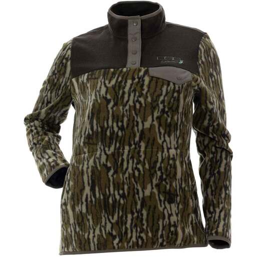 DSG Outerwear Women's Mossy Oak Bottomland Gianna 2.0 Hunting Shirt - Perfect for keeping you warm and comfortable during your next hunting trip or casual outing, the Gianna 2.0 Pullover is the most cozy and versatile hunting pullover yet. Soft micro fleece fabric finished with a DWR treatment for water repellency Soft elastic binding around collar, cuff openings, and bottom hem Center front quarter snapped ripstop placket Chest pocket with snap closure Hand warmer pockets Style: 516674