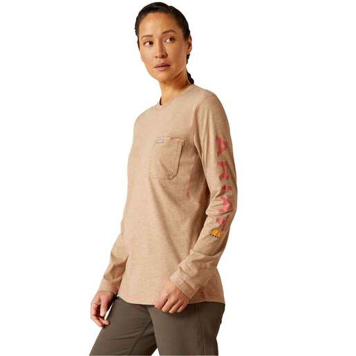 Ariat Women's Rebar Workman Logo Long Sleeve Work Shirt - Performance and durability you can count on, in a comfy graphic t-shirt. With stain-resistant fabric that wicks sweat to help you stay dry, this work-week essential lets you rep Ariat on and off the jobsite. Greater Arm Mobility lets you move freely Moisture Movement Technology helps keep you dry VentTEK technology puts airflow where you need it most to keep you cool Stain repellent Ribbed collar Breathable mesh paneling Contrast top stitching Drop tail hem Screen printed logos Hidden pen slot Reinforced chest pocket Style: 10052844