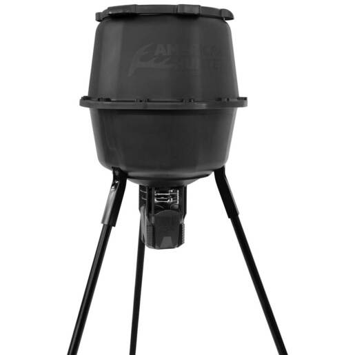 American Hunter XD-Pro Game Feeder with 30 Gallon Hopper - The American Hunter XD-Pro Game feeder is easy to set-up and easy to load. Operating from a rechargeable 6 volt battery this feeder can be set to feed up to 16 times per day for 1-60 seconds per dispensing cycle. There are two Q-Set preconfigured settings for easy setup. The large LCD screen is easy to see when programming. A metal Varmint Guard, with optional shocking circuitry helps protect you feed supply from pest such as raccoons and squirrels. The XD-Pro is pre-wired for the Varmint Zapper Module, Solar Panel and Remote Activator. When it is time to prepare for hunting season prepare with an American Hunter feeder. Digital timer with large LCD display Metal spin plate Q-Sets – 2 pre-configured settings for easy setup Adjustable feed rate 1-60 seconds Feeds 1 to 16 times per day Metal Varmint guard with optional shocking circuit Pre-wired for Varmint Zapper Module Activator, Solar Panel AH-VZM and Remote Activator AH-RMT Recommended DE-30045 battery – (not included) Three 8-FT sectional heavy-duty metal leg
