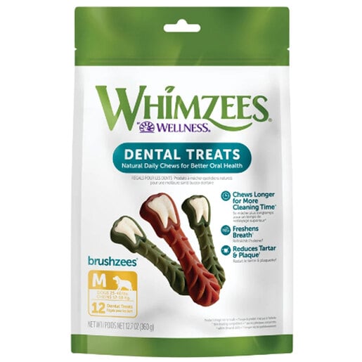 Whimzees All Natural Daily Dental Brushees Dental Dog Treats - Brushzees feature grooves and ridges on our daily dental treat to help reduce plaque and tartar like never before. Engineered for the way dogs grip and chew, they turn playtime into fresher breath and cleaner teeth, giving dogs a reason to jump for joy. With just 6 key ingredients, Brushzees dental chews are crafted to be limited ingredient, vegetarian and grain-free to deliver a healthy option for all dogs including those with food sensitivities Added ridges help dogs to easily grip and chew so with each bite WHIMZEES Brushzees helps dogs clean their teeth including in those hard to places for a fresher breath, healthy gums and reduced plaque and tartar build up Low fat supports daily calorie intake and added fiber helps digestive health Produced sustainably with no artificial ingredients, colors, flavors or preservatives, gluten or meat