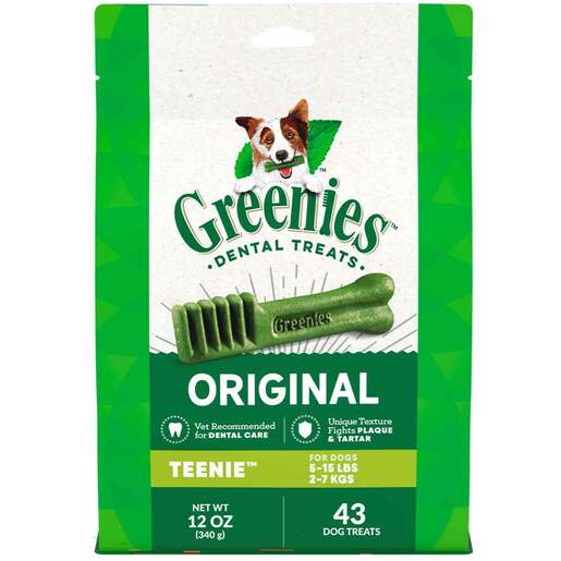 Greenies Original Teenie Dental Treats - One GREENIES Original Dental Treat a day is all it takes for clean teeth, fresh breath, and a happy dog. Your dog can't wait to sink their teeth into these delicious, original-flavor dental dog chews because they feature a delightfully chewy texture that fights plaque and tartar. Irresistibly tasty and incredibly powerful, GREENIES Treats for Dogs are vet recommended for at-home dental care. Best of all, these natural dog treats are the perfect breath freshener to help fight bag dog breath and are made with highly soluble ingredients that are safe and easy to digest. Give your canine the mouth-wowing treat that helps promote their oral hygiene and overall health with GREENIES Dog Treats. Great for toy breeds and dogs between 5 and 15 pounds. Natural Dog Treats Plus Vitamins, Minerals, and Other Nutrients.