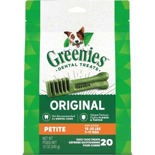 Greenies Original Petitle Treat Pak Dog Treats - One Greenies Original Dental Treat a day is all it takes for clean teeth, fresh breath, and a happy dog. Your dog can't wait to sink their teeth into these delicious, original-flavor dental dog chews because they feature a delightfully chewy texture that fights plaque and tartar. Irresistibly tasty and incredibly powerful, GREENIES Treats for Dogs are vet recommended for at-home dental care. Best of all, these natural dog treats are the perfect breath freshener to help fight bag dog breath and are made with highly soluble ingredients that are safe and easy to digest. Give your canine the mouth-wowing treat that helps promote their oral hygiene and overall health with GREENIES Dog Treats. Feed one Greenies Dental Chew per day. For dogs 15-25 lbs. Not suitable for dogs less than 5 lbs, or dogs less than 6 months of age. Fresh drinking water should always be available. Choose the Right Size for Your Dog: Teenie: 5-15 lbs./2-7 kg Petite: 15-25 lbs./7-11 kg Regular: 25-50 lbs./11-22 kg Large: 50-100 lbs./22-45 kg