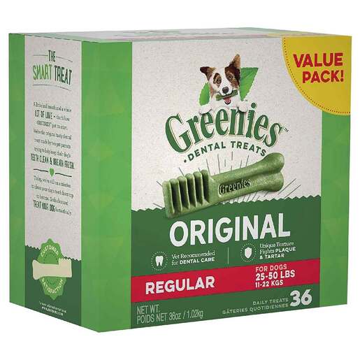 Greenies Original Regular Dental Dog Treats - One GREENIES Original Dental Treat a day is all it takes for clean teeth, fresh breath, and a happy dog. Your dog can't wait to sink their teeth into these delicious, original-flavor dental dog breath chews because they feature a delightfully chewy texture that fights plaque and tartar. Irresistibly tasty and incredibly powerful, GREENIES Treats for Dogs are vet-recommended for at-home oral health care and accepted by the VOHC (Veterinary Oral Health Council.) Best of all, these natural dog breath treats are made with highly soluble ingredients that are safe and easy to digest. Give your dog the mouth-wowing treat that helps promote their overall health with GREENIES Dog Treats. Natural Dog Treats Plus Vitamins, Minerals, and Other Nutrients. For dogs 25-50lbs
