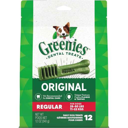Greenies Original Regular Treat Pak Dog Treats - One Greenies Original Dental Treat a day is all it takes for clean teeth, fresh breath, and a happy dog. Your dog can't wait to sink their teeth into these delicious, original-flavor dental dog chews because they feature a delightfully chewy texture that fights plaque and tartar. Irresistibly tasty and incredibly powerful, GREENIES Treats for Dogs are vet recommended for at-home dental care. Best of all, these natural dog treats are the perfect breath freshener to help fight bag dog breath and are made with highly soluble ingredients that are safe and easy to digest. Give your canine the mouth-wowing treat that helps promote their oral hygiene and overall health with GREENIES Dog Treats. Feed one Greenies Dental Chew per day. For dogs 25-50 lbs. Not suitable for dogs less than 5 lbs, or dogs less than 6 months of age. Fresh drinking water should always be available—natural Dog Treats Plus Vitamins, Minerals and Other Nutrients.