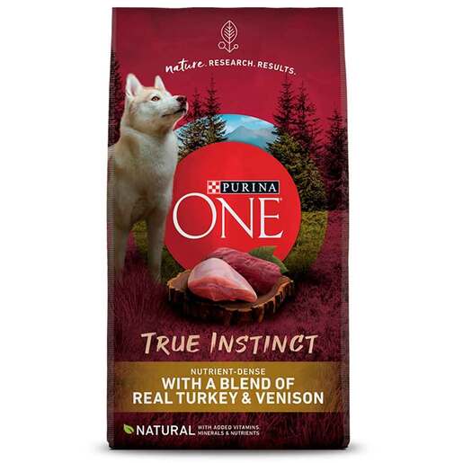 Purina ONE True Instinct Real Turkey & Venison Dry Dog Food - No matter how far science advances us, we always look to nature to inspire us. Crafted to be a dog food closer to what nature intended, Purina ONE True Instinct recipes start with a SmartBlend of natural ingredients, backed by research. The result is truly healthy nutrition filled with more of what you want, and less of what you don’t. That means 30% protein, with a blend of real turkey & venison, and no poultry by-product meal, artificial flavors or preservatives. This is natural nutrition your dog instinctively craves. Natural With Added Vitamins, Minerals & Nutrients Real Turkey is the #1 Ingredient Nutrient-Dense Formula with 30% Protein 4 Sources of Antioxidants to Help Support a Healthy Immune System Supports Strong Muscles, Including a Healthy Heart Purina ONE Formulas are Veterinarian Recommended