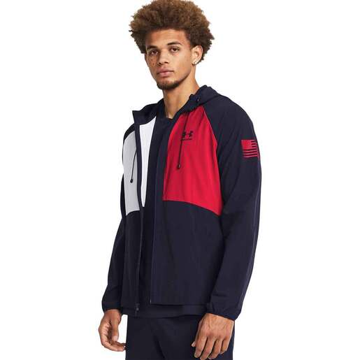 Under Armour Men's Freedom Windbreaker Casual Jacket - Under Armour Freedom's goal is to support and inspire the brave men and women dedicated to protecting us, every day. Raglan sleeves 87% polyester/13% elastane UA Storm technology repels water without sacrificing breathability Wind-resistant materials & construction shield you from the elements Lightweight stretch-woven fabric provides superior mobility & durability 4-way stretch material moves better in every direction Generous, 3-panel hood with drawcord adjust Secure, zip hand pockets Exposed elastic binding at cuffs to help keep sleeves in place Uses a fluorine-free water repellent treatment Style: 1382947