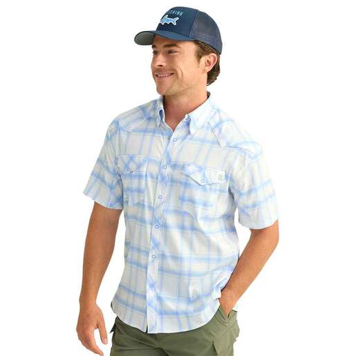 Huk Men's Diamond Back Plaid Short-Sleeve Fishing Shirt - Elevate your fishing experience with the Diamond Back Short-Sleeve Shirt that boasts a stylish aesthetic for fashion-forward anglers. Crafted from ultra-lightweight stretch nylon blend fabric, the vented back adds a touch of western-inspired design while maintaining functionality. The Diamond Shirt also offers UPF 50+ protection, an interior eye wipe, snap closures and moisture transport for ultimate comfort and practicality. Interior Glasses Wipe 100% Polyester Style: H1500205