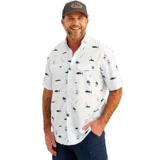 Huk Men's Tide Point KC Print Short-Sleeve Fishing Shirt - The Tide Point shirt is designed to easily transition from the boat to the boardroom. With all-day comfort for both on and off the water pursuits, the Tide Point is constructed using lightweight, breathable, quick-drying, moisture-wicking fabric with two-way stretch and built-in microfiber sunglass wipe. 30+ UPF rating Two-way stretch Built-in microfiber sunglass wipe Laser perforated underarms and back for supreme breathability Style: H1500221