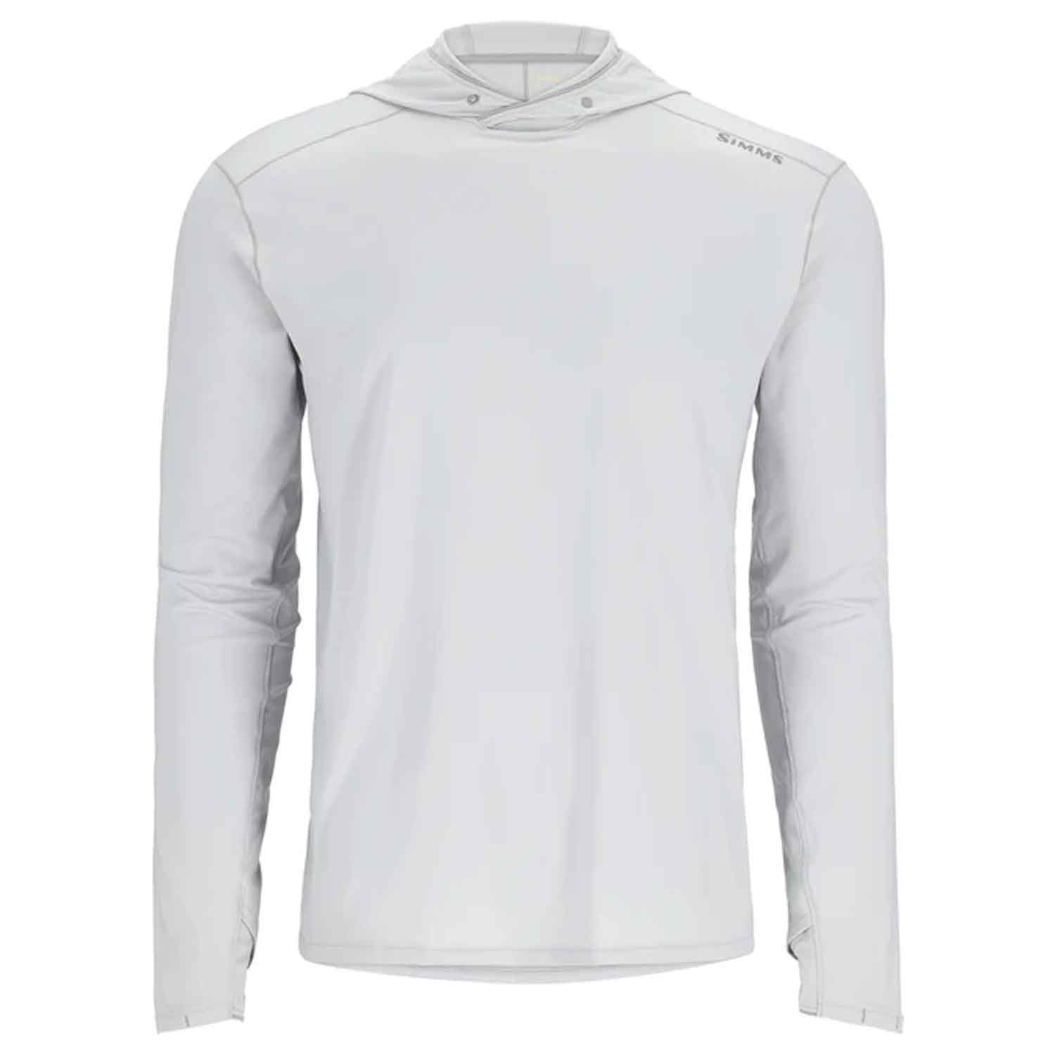 Simms Men's SolarFlex Hooded Long Sleeve Fishing Shirt - The SolarFlex Hoody stretches hot-day performance with a mobility-minded, UPF 50-rated construction, essential back-of-hand sun coverage and a hood closure that locks in protection for full-throttle boat runs and sunny days. Keeps you odor-free with HeiQ Fresh and HeiQ Stain Away Highest performing solar protective knit fabric 3-panel hood designed to shield from the sun and stay on with a stretch binding and snap closure Extended sleeve length with envelope thumbholes and a center finger loop for back-of-hand sun protection Combination of marrow seams & flat-seam construction Style: 13658