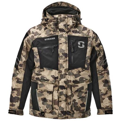 Striker Men's Climate Ice Fishing Jacket -The Striker Climate Jacket gives you the versatility to fish all season long in all regions of the ice belt. Quickly layer up or down with the removable Adapt Insulated Jacket, giving you a 3-in-1 system to wear together or separate depending on the weather, location, or your fishing style. Perforated Sureflote flotation assist technology is permanently fixed in the outer shell and is designed to improve moisture management and overall suit breathability, making the Climate Jacket a do-it-all solution for any angler. 3-n-1 jacket system with removable Adapt Insulated Jacket provides full season versatility and complete customization to changing weather conditions. Perforated Sureflote flotation assist technology enhances breathability and improves overall jacket comfort and maneuverability. Fully taped waterproof seams keep blowing snow and slush on the outside. Magnetic center front storm flap makes suiting up quick and easy. Equipped with Line Cutterz Zipper Pull for a safe and efficient way to quickly cut any fishing line. Fleece lined collar, hood, and hand pockets. Reflective elements throughout for low light safety. Adjustable hood and hem cinch. Pit zips for ventilation when on the move. Fit: Sized to fit over base layer, mid-layer (hoody), and bibs. Tall sizes add 2in in body and sleeve length. Waterproofness: Hydrapore 5,000 mm – suitable for typical ice fishing conditions. Breathability: Hydrapore suitable for limited to moderate movement. Shell 1: 100% Polyester Shell 2: 100% Nylon Lining: 100% Polyester Taffet Insulation: Removable, PrimaLoft Black 60g (Adapt Insulated Jacket) Sureflote Flotation Assist Windproof DWR treated for water resistance YKK 8 Vislon center front zipper Zippered Chest Pockets Hoop and Loop Cargo Pockets Zippered Hand Pockets Removable Hood