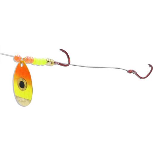 JB Lures Hot Flash Indiana Blade 2 Hook Harness - The Hot-Flash blade creates a swimming minnow effect. A hammered blade. Two-toned look to the front of the blade. The darker colors are at the top of the blade while an oversize prism eye is applied to create the head of the minnow. Finally a coat of glitter is applied to simulate the scales. The entire blade is coated with epoxy to enhance the colors and protect the finish. Unique swimming minnow look. The blade is the end result of reading and listening to what elements make up the ultimate spinner blade.