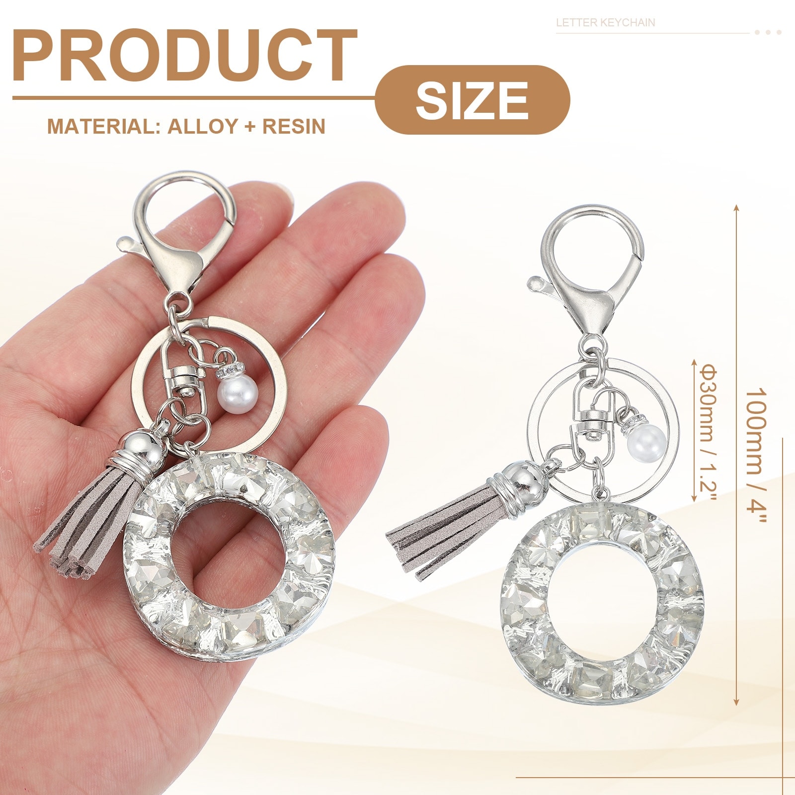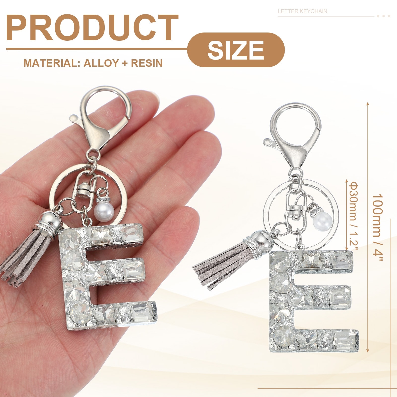 Initial Letter Keychain with Tassel and Pearl, Bling Alphabet Letter Keyring Rhinestone Keychains with Key Ring - Silver
