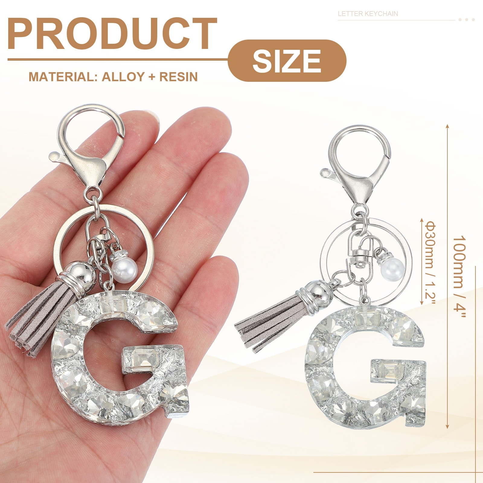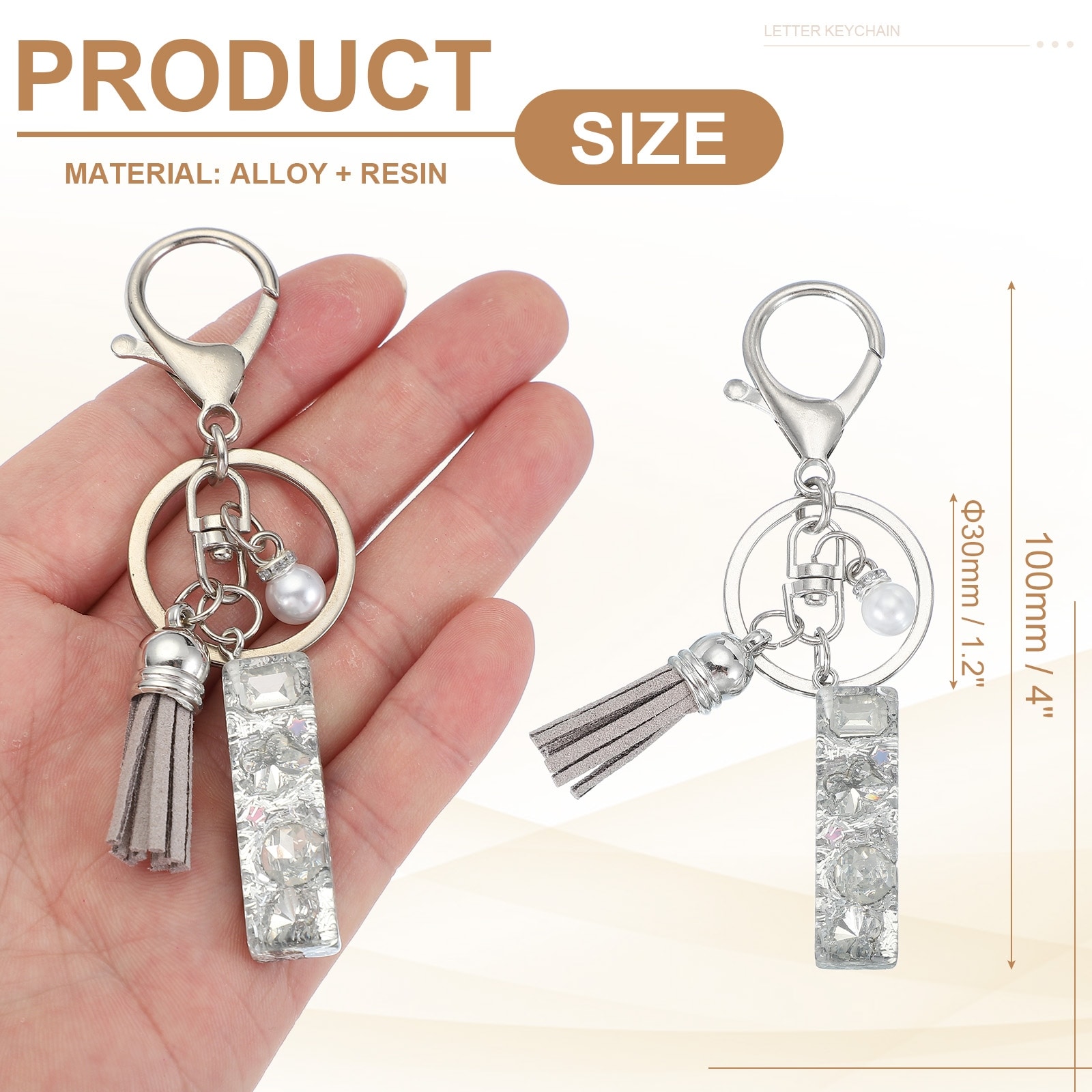 Initial Letter Keychain with Tassel and Pearl, Bling Alphabet Letter Keyring Rhinestone Keychains with Key Ring - Silver