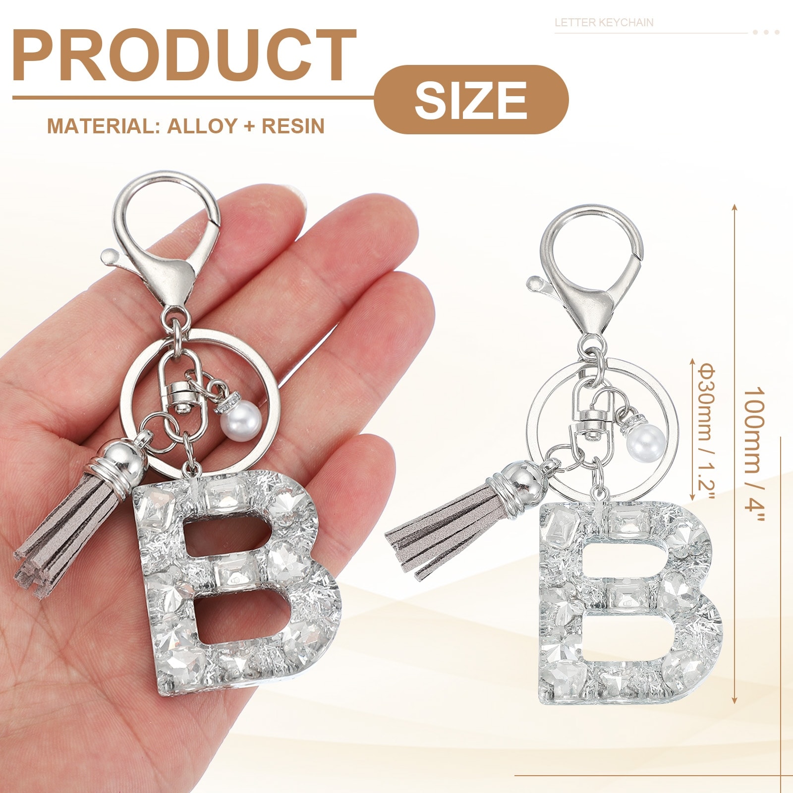 Initial Letter Keychain with Tassel and Pearl, Bling Alphabet Letter Keyring Rhinestone Keychains with Key Ring - Silver
