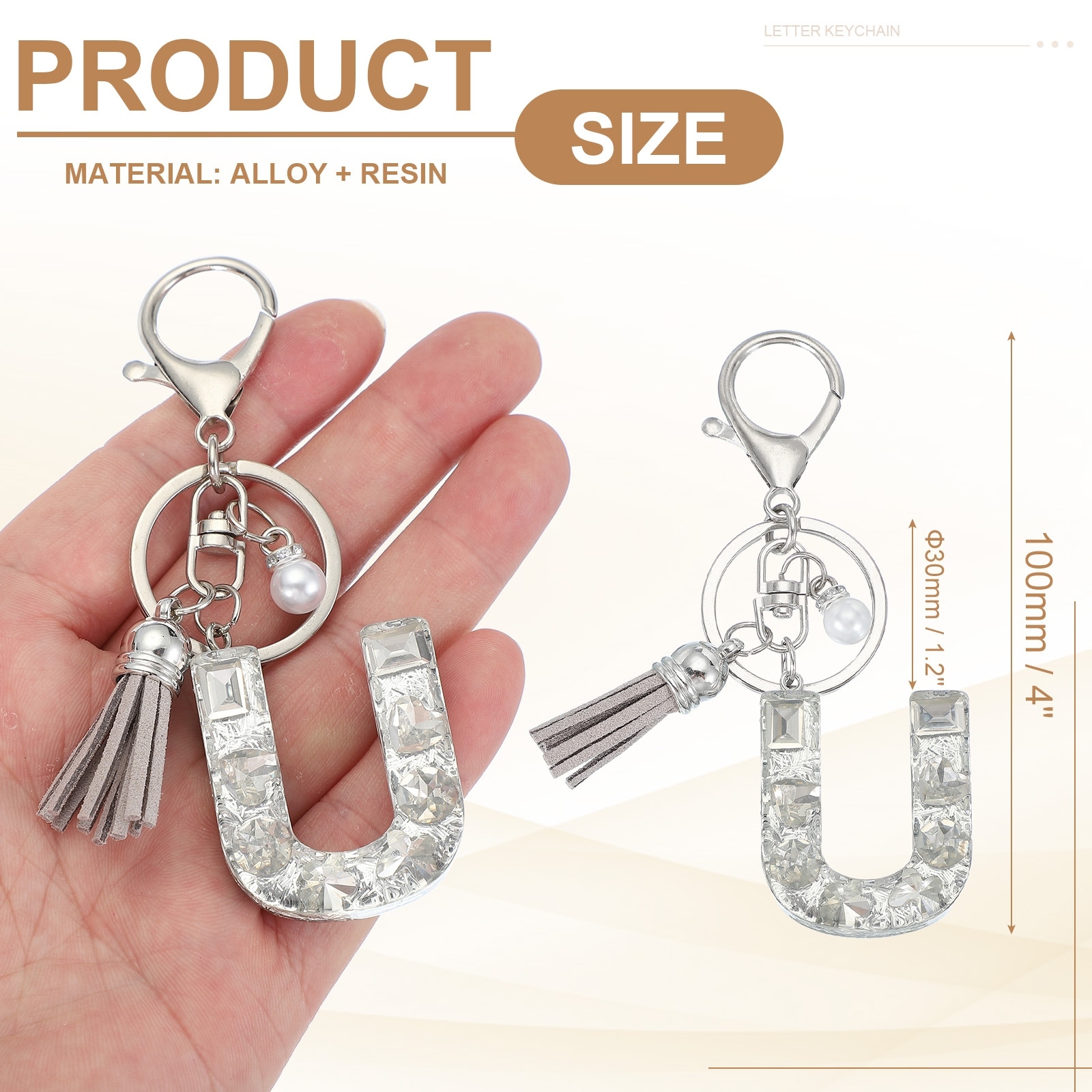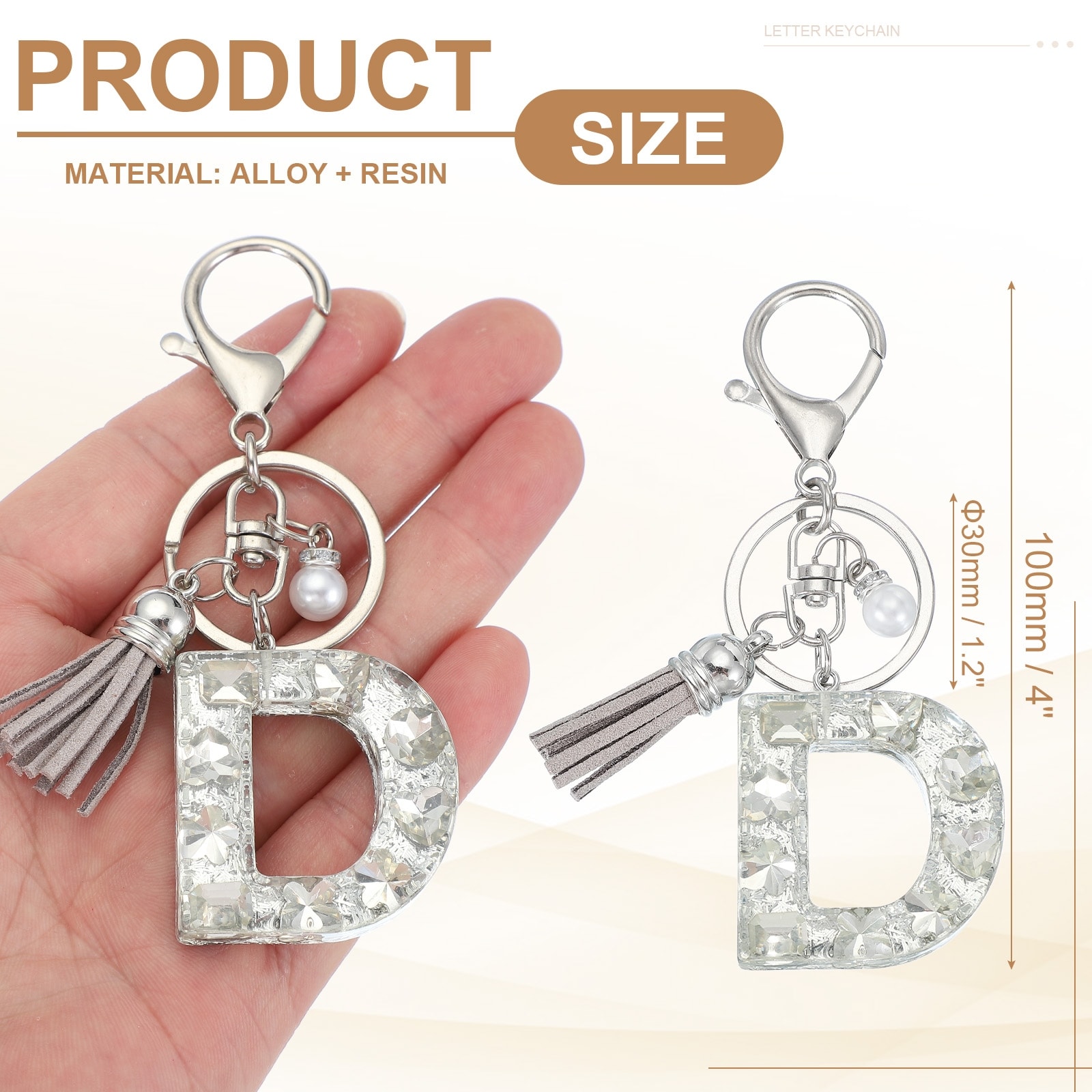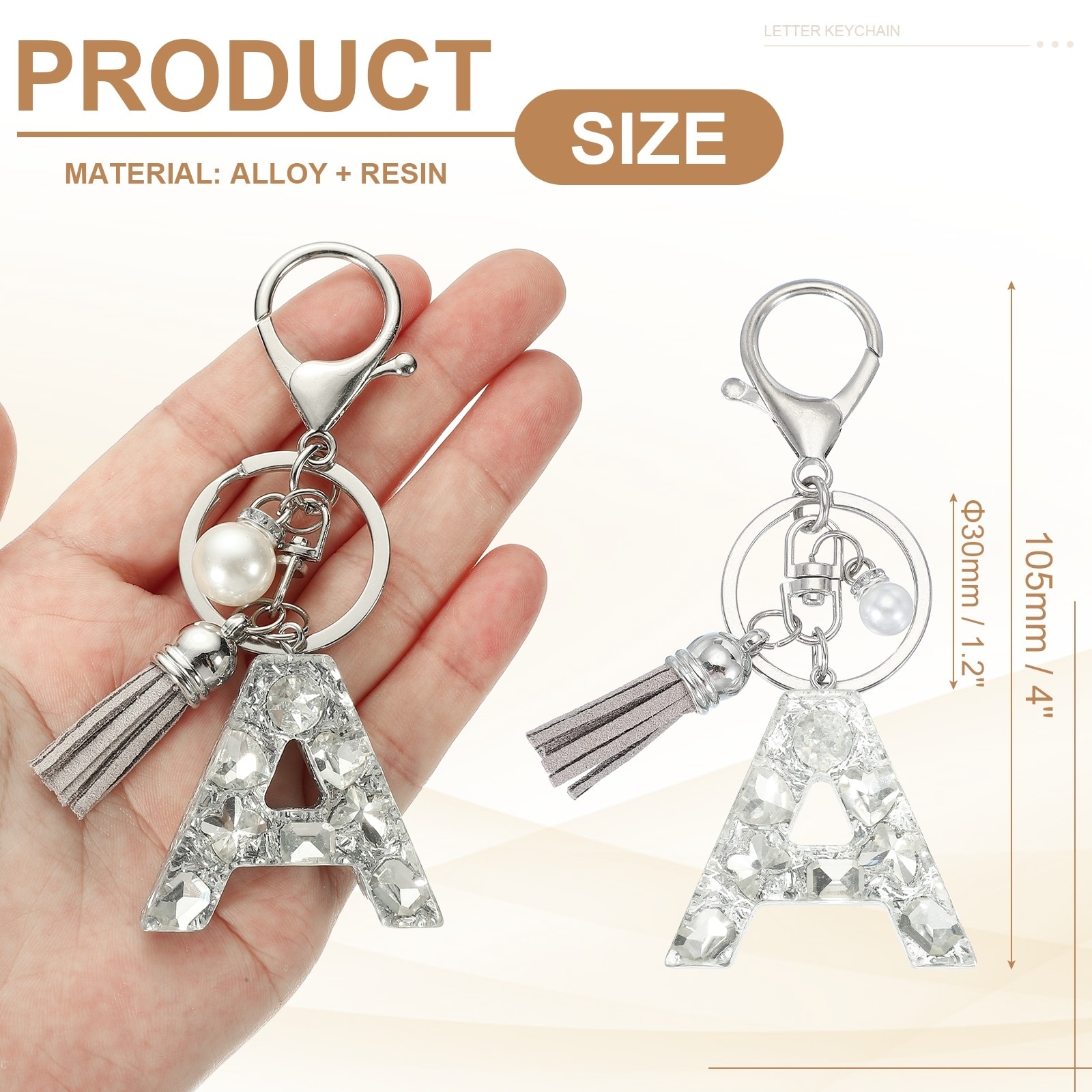 Initial Letter Keychain with Tassel and Pearl, Bling Alphabet Letter Keyring Rhinestone Keychains with Key Ring - Silver