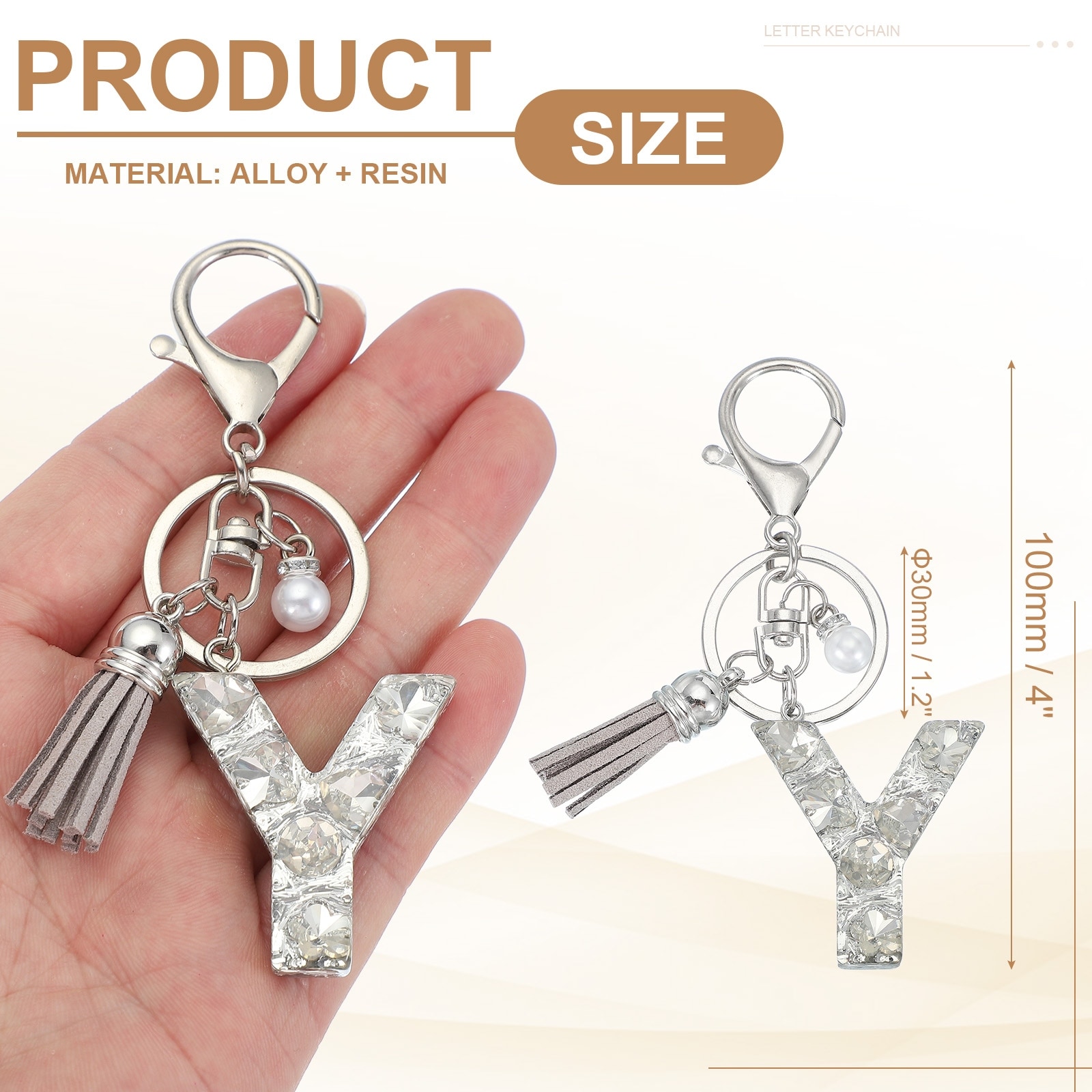 Initial Letter Keychain with Tassel and Pearl, Bling Alphabet Letter Keyring Rhinestone Keychains with Key Ring - Silver