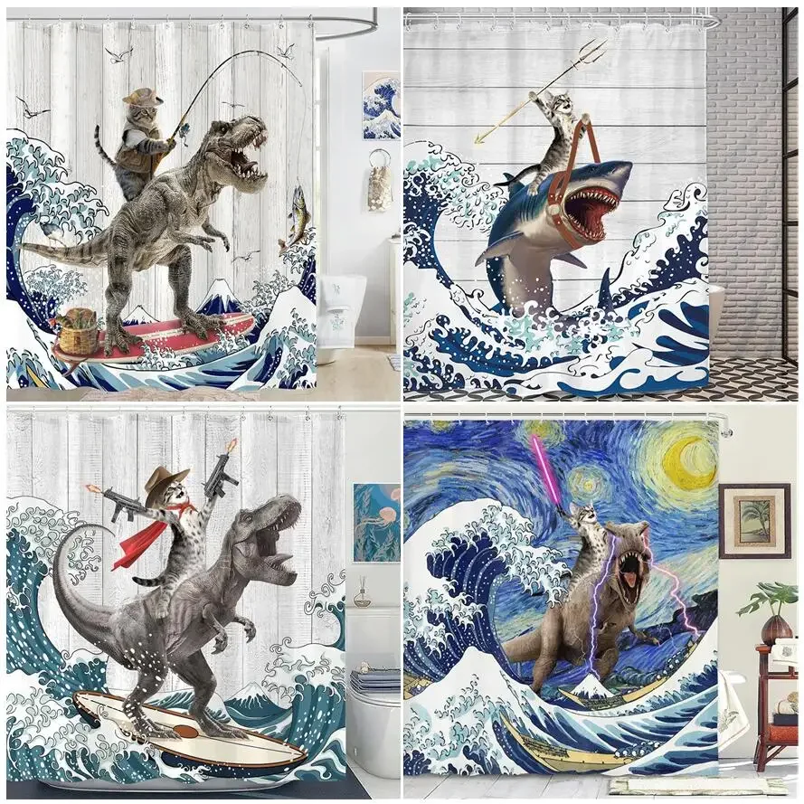 Creative Funny Cat Riding Dinosaur Shower Curtain Ocean Sea Waves Polyester Bathroom Decor With Hook 120x180cm 8