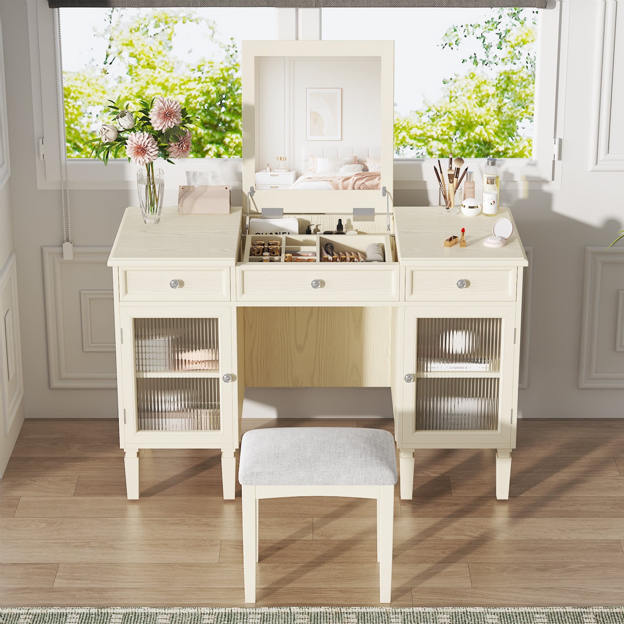 2-in-1 Vanity Desk with Flip-Top Mirror, Dressing Table Set with Drawer & Cabinet, White Oak
