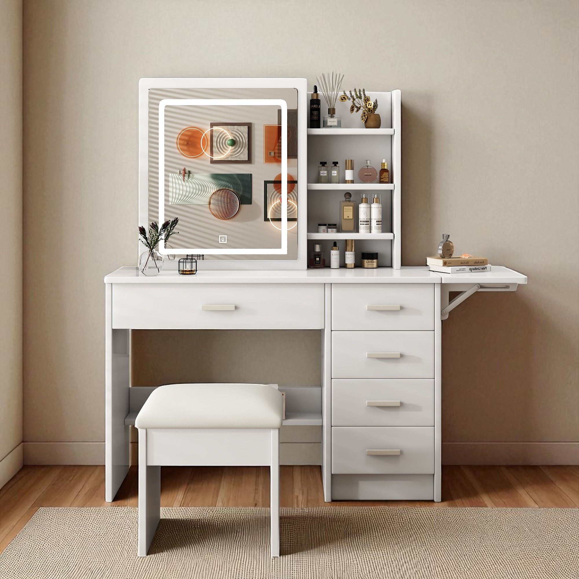 Vanity Desk with Mirror and Lights,Makeup Vanity Table Set with Open Shelves Chair,5 Drawers,3 Color Adjustable Lighting