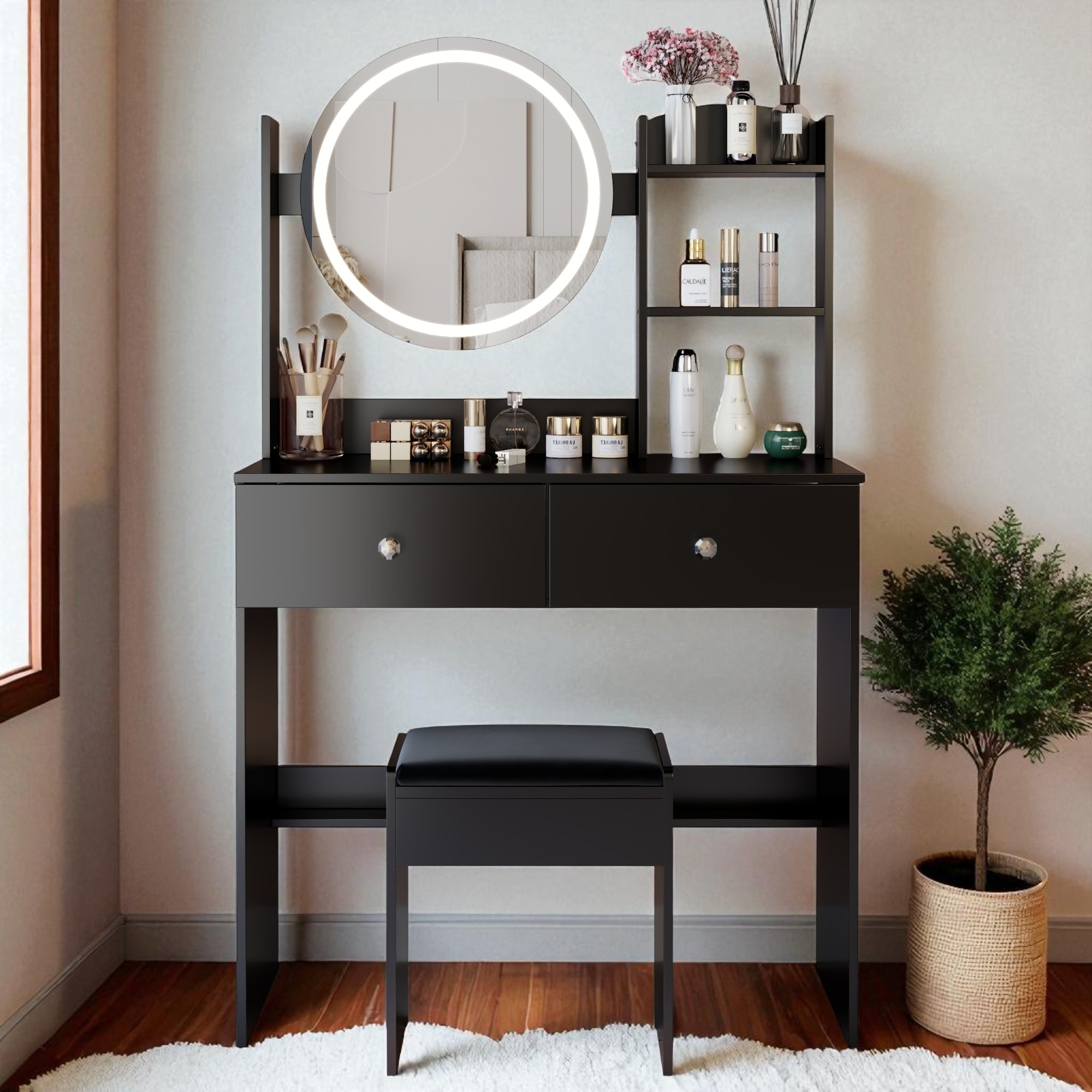 31.5" Vanity Table with 17" LED Mirror & Stool, Touch Control 3-Color Dimmable Light, Large Desktop, Multi-Layer Storage