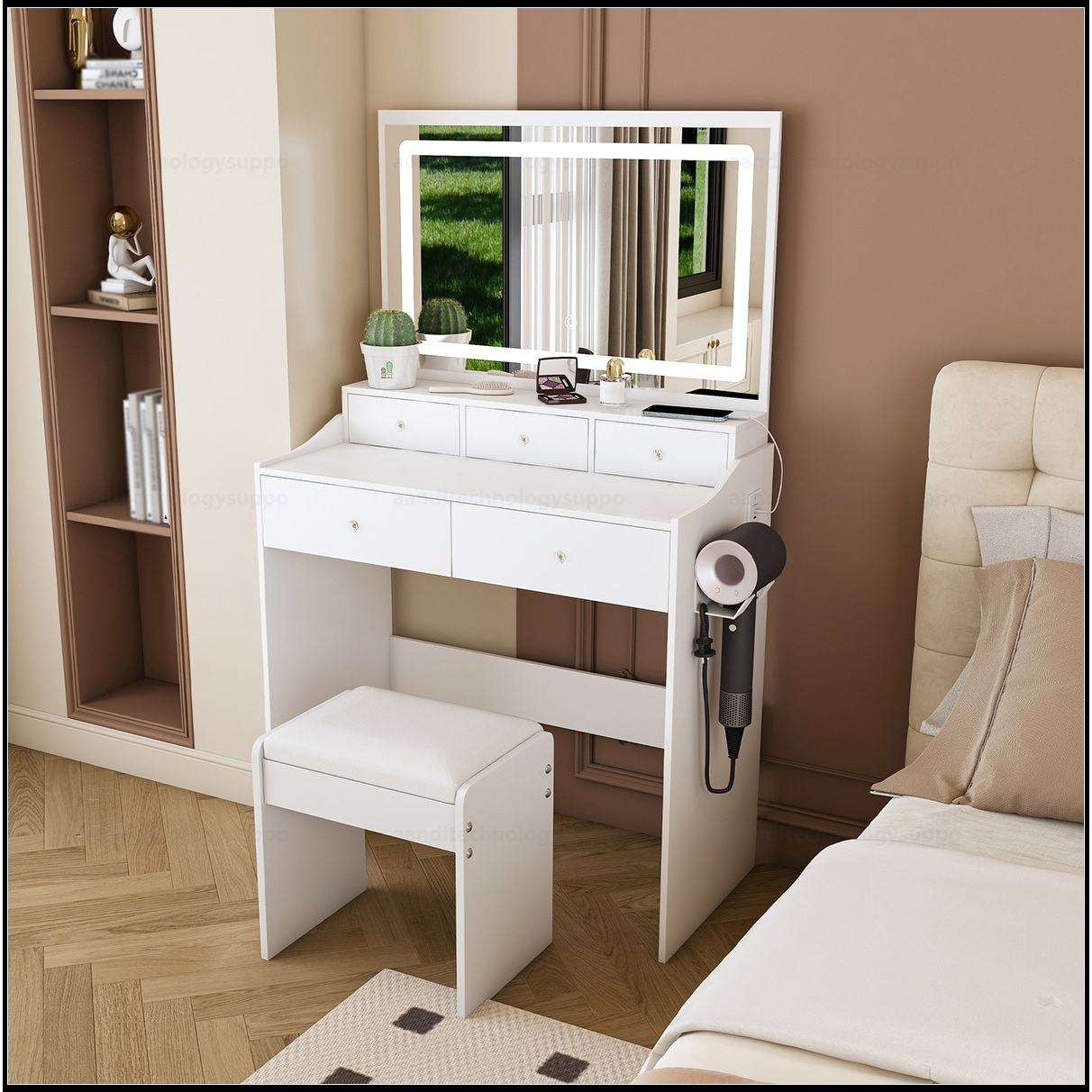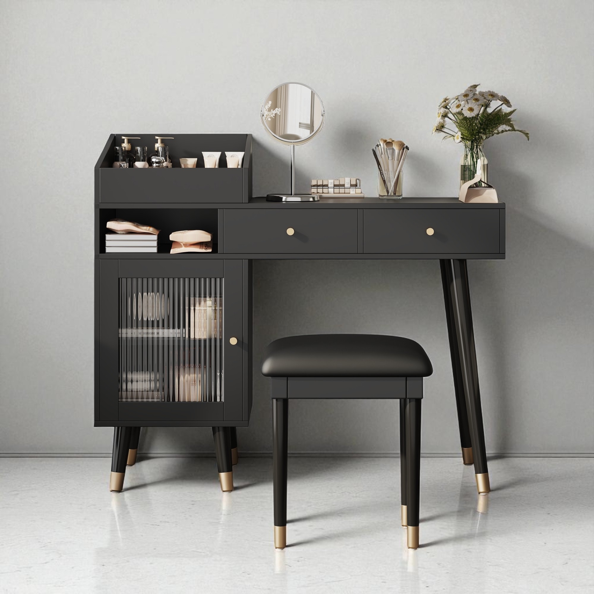 Modern Makeup Vanity Desk with Drawers, Cabinet & Charging Port,Space-saving Dressing Table Set with Stool for Small Spaces.