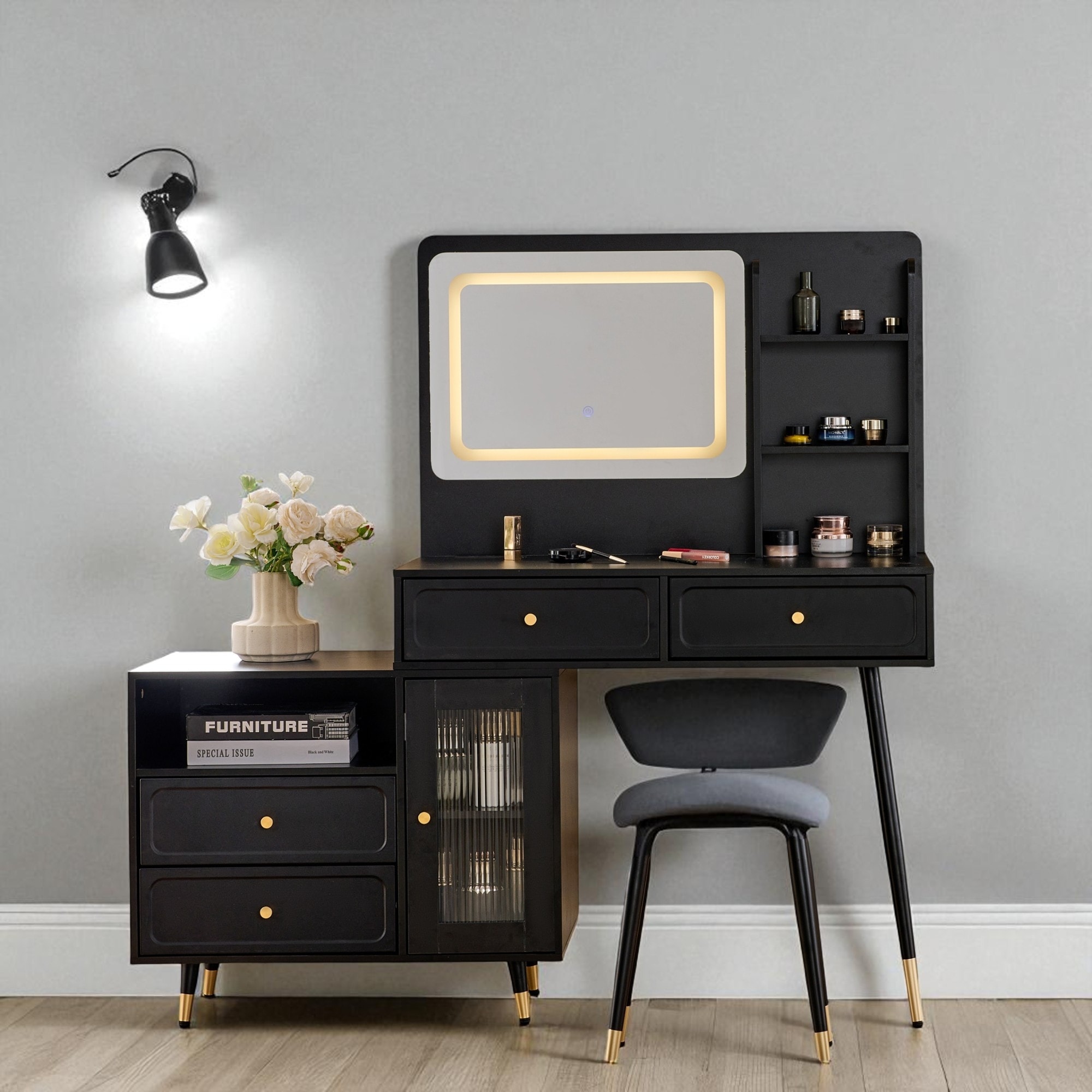 Modern Vanity Desk with Mirror and Lights, Adjustable Makeup Table with Drawers,Cabinet & Power Outlet for Bedroom Decor.