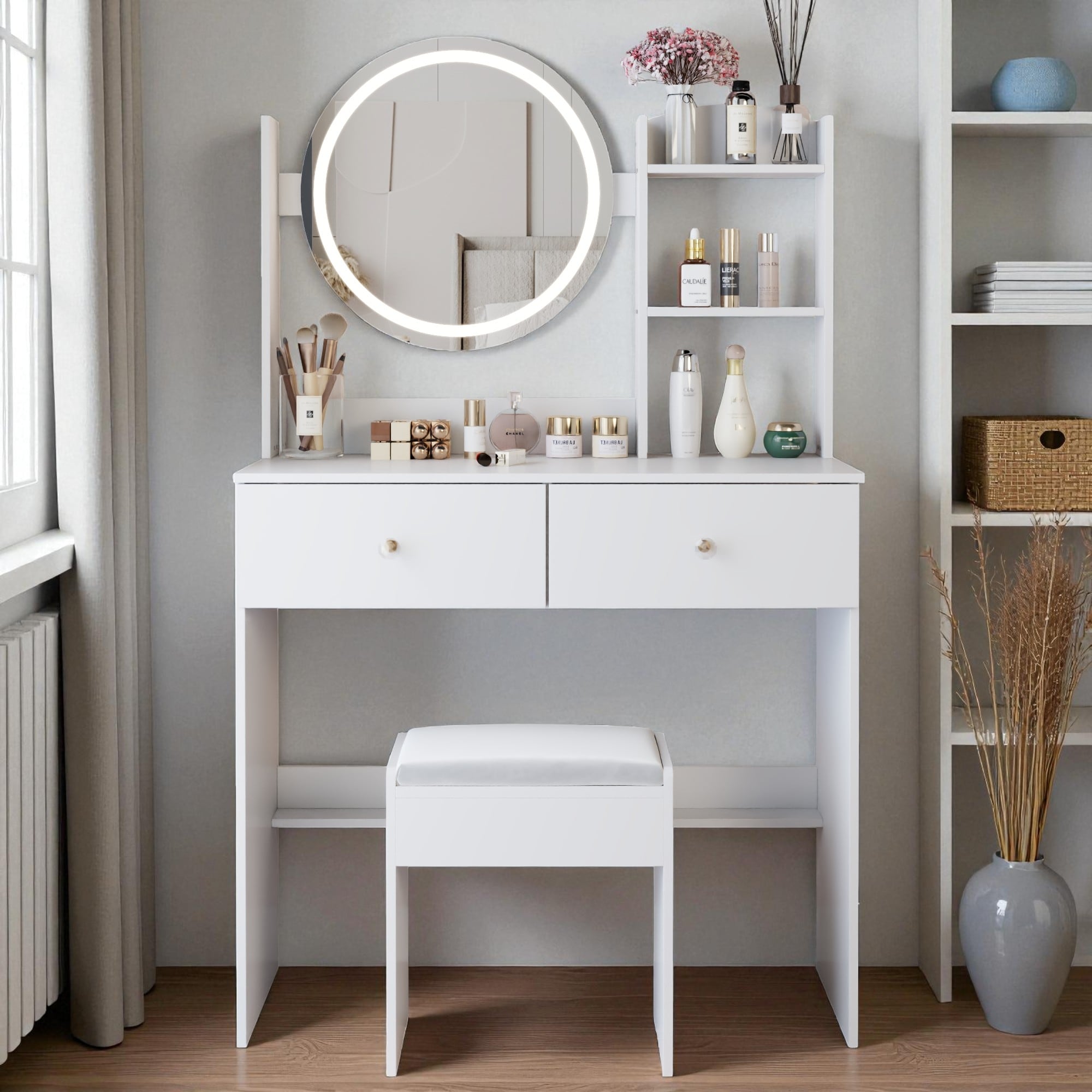 31.5" Vanity Table with 17" Round LED Mirror & Stool, Touch Control 3-Color Light, Adjustable Brightness, Multi-Layer Storage