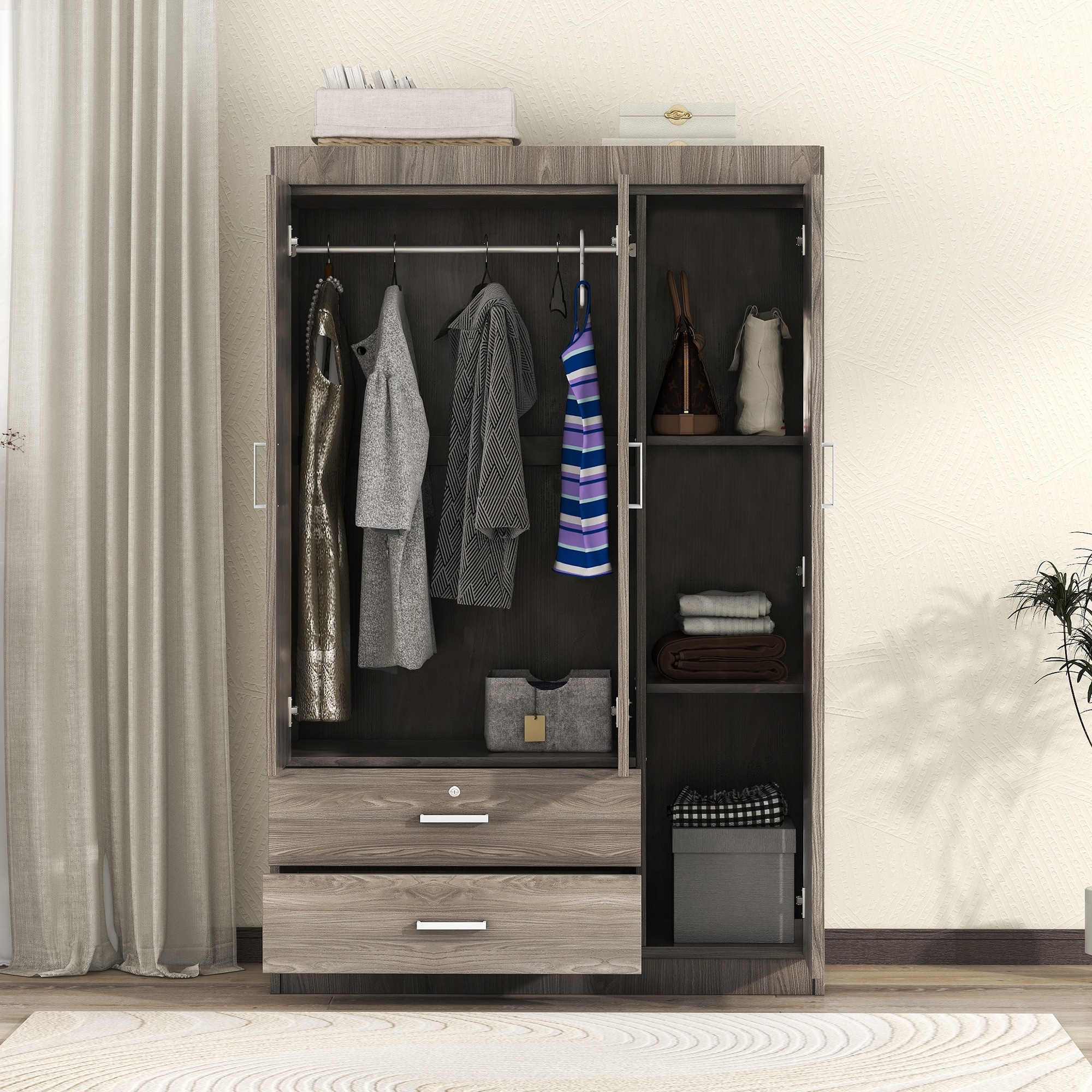 Simple Wardrobe Closet Armoire with Drawers, Gray Wardrobe Cabinet Clothing Storage Cabinet with Hanging Rails