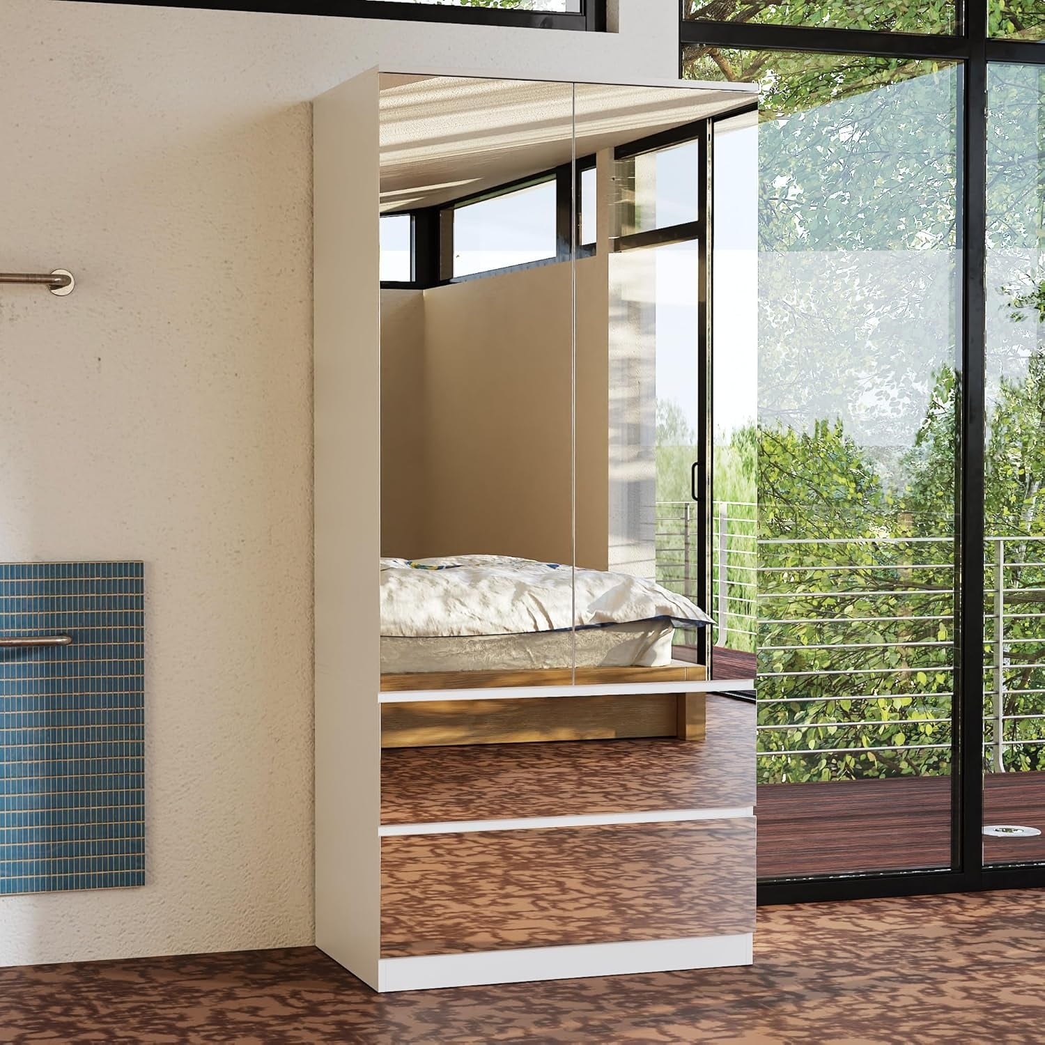 All-Mirror Wooden Wardrobe Closet with 2 Doors, 2 Drawers & Hanging Rod for Bedroom Storage, White