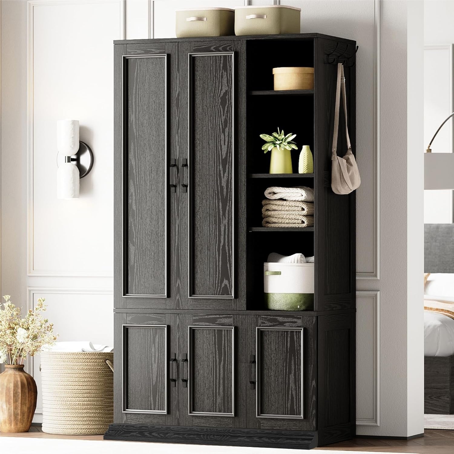 70 Inch Tall 5-Door Wooden Wardrobe with 4 Shelves and Hanging Rod, Black
