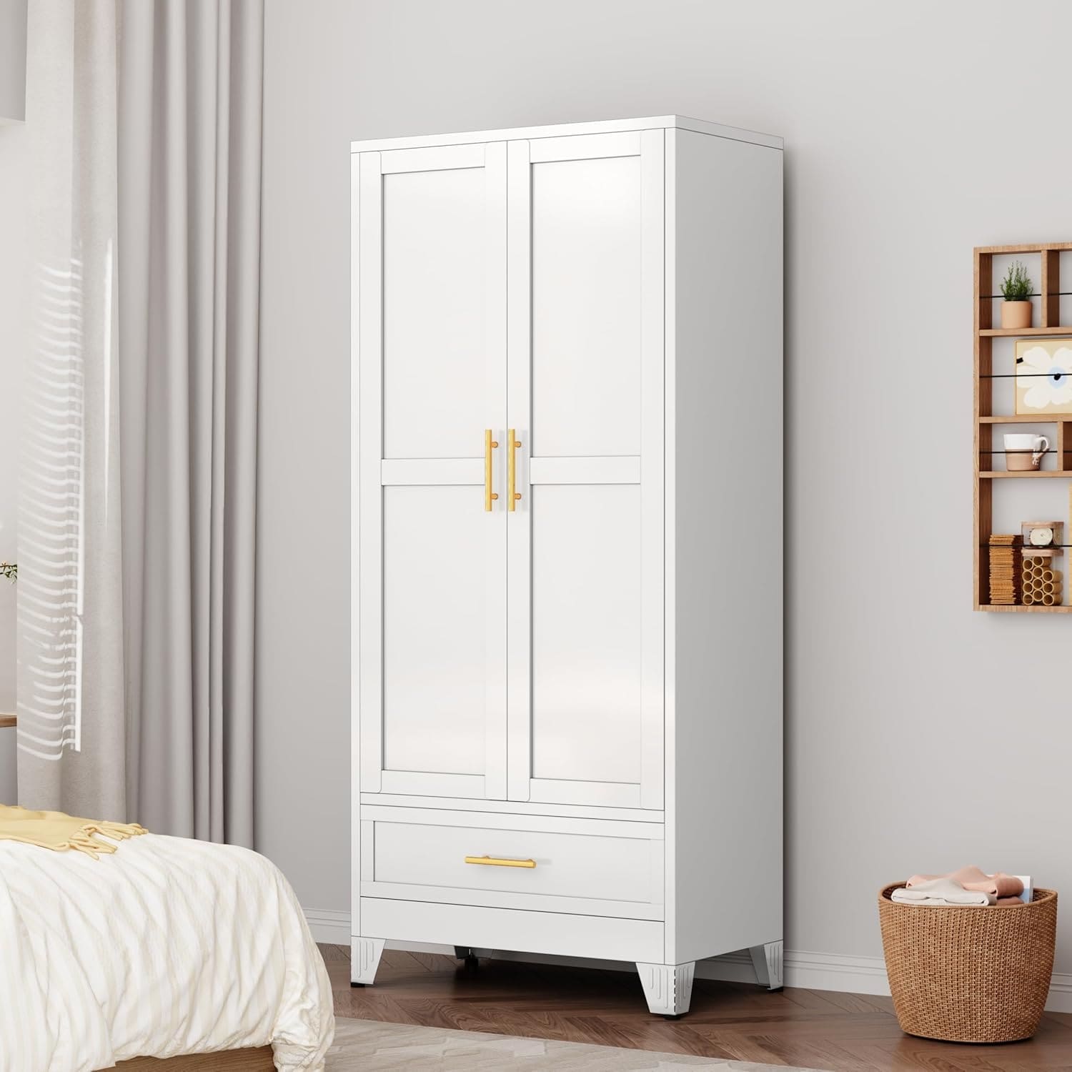 71 Inch White Metal Armoire Wardrobe with Adjustable Shelves and Drawer for Bedroom Storage