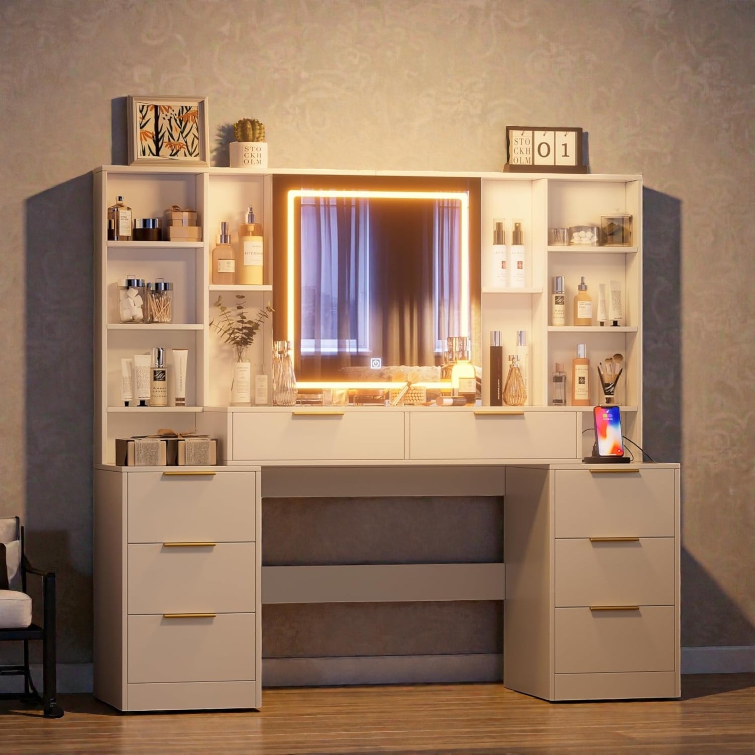 Makeup Vanity Table with Adjustable Lighting, Oversized Drawer, 3 Shelves and Cabinet Storage