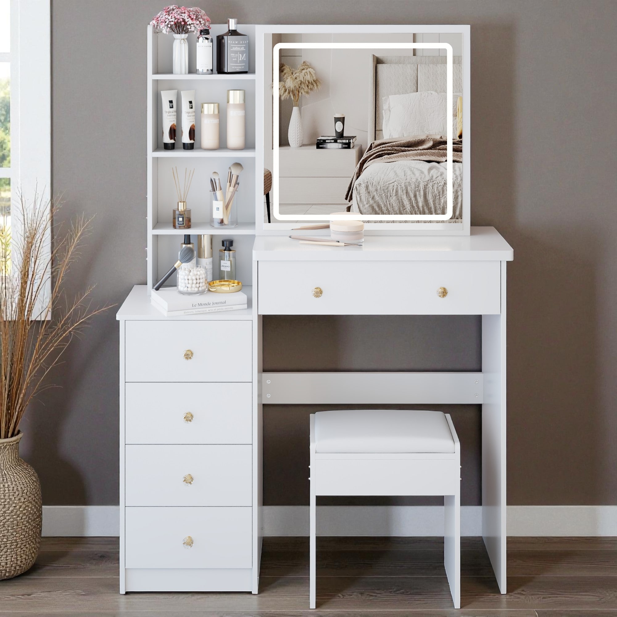 37" Middle Size Left Drawer Desktop Vanity Table + Cushioned Stool, Large Sliding, Touch Control, Brightness Adjust LED Mirror