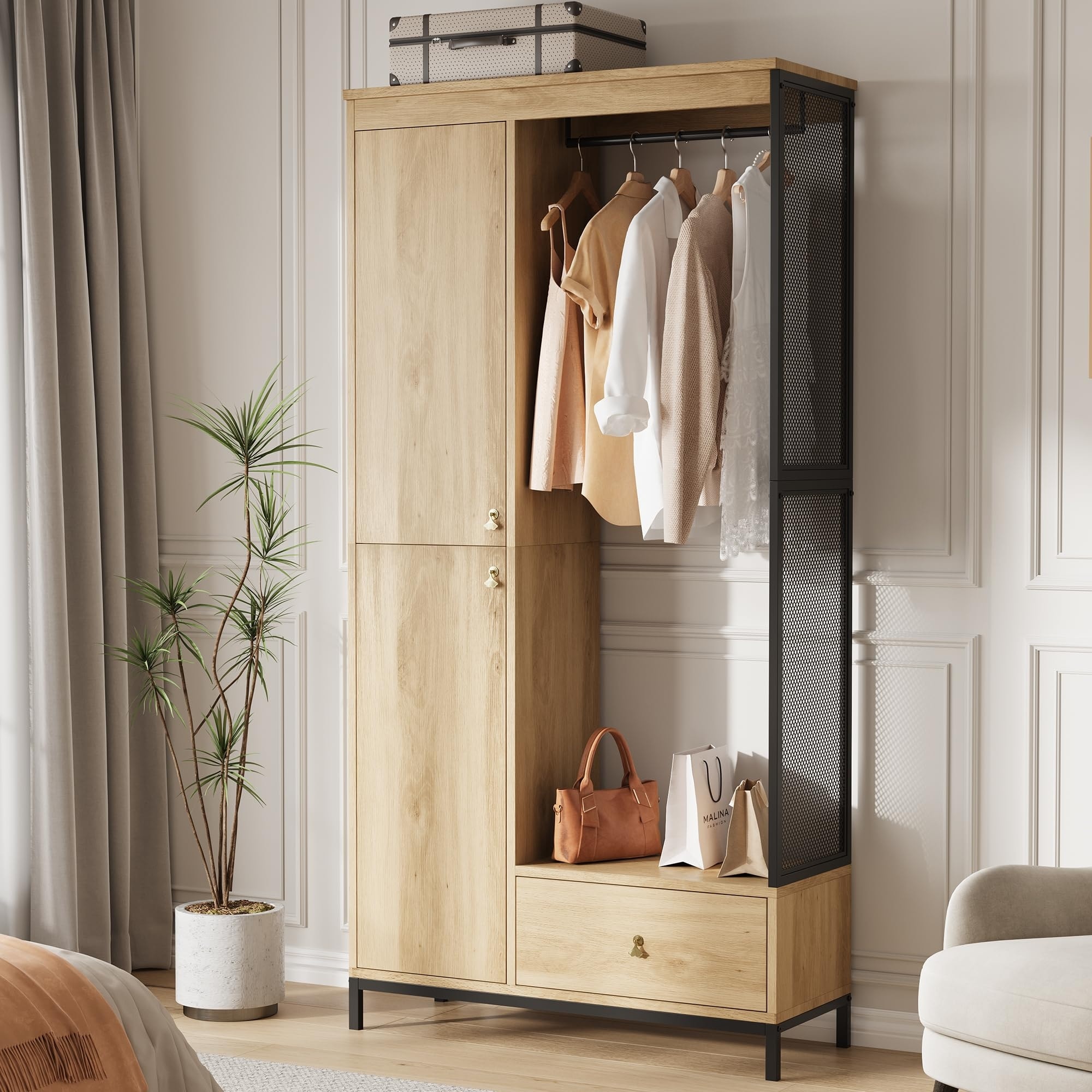Freestanding Closet Organizer with Shelves and Hanging Rod, Modern Metal Wardrobe Rack with Mesh Side & Drawer