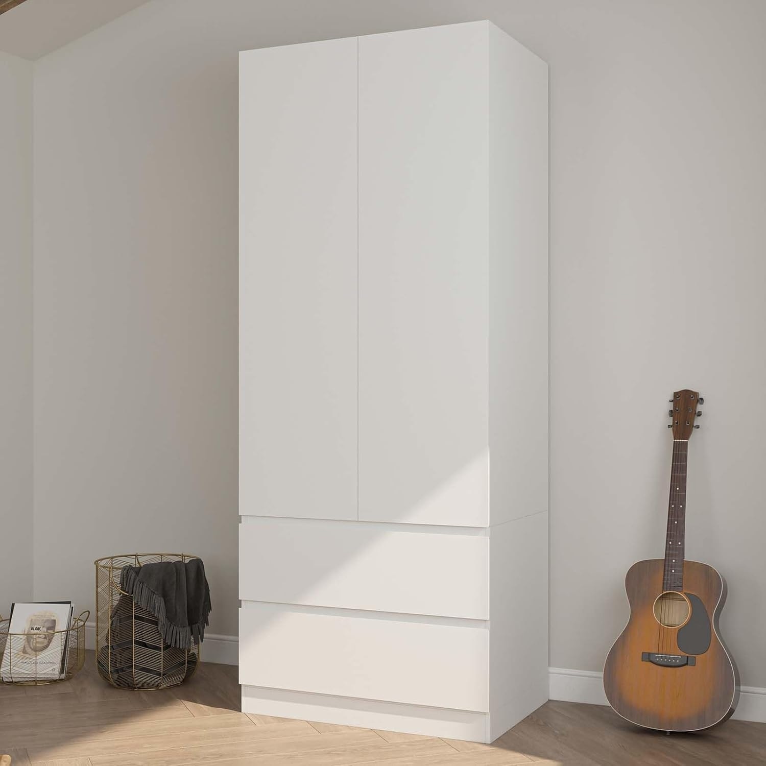 White Wardrobe Closet with 2 Drawers & 2 Doors, Hanging Rod, for Bedroom (31.5"W x 20.39"D x 78.74"H)
