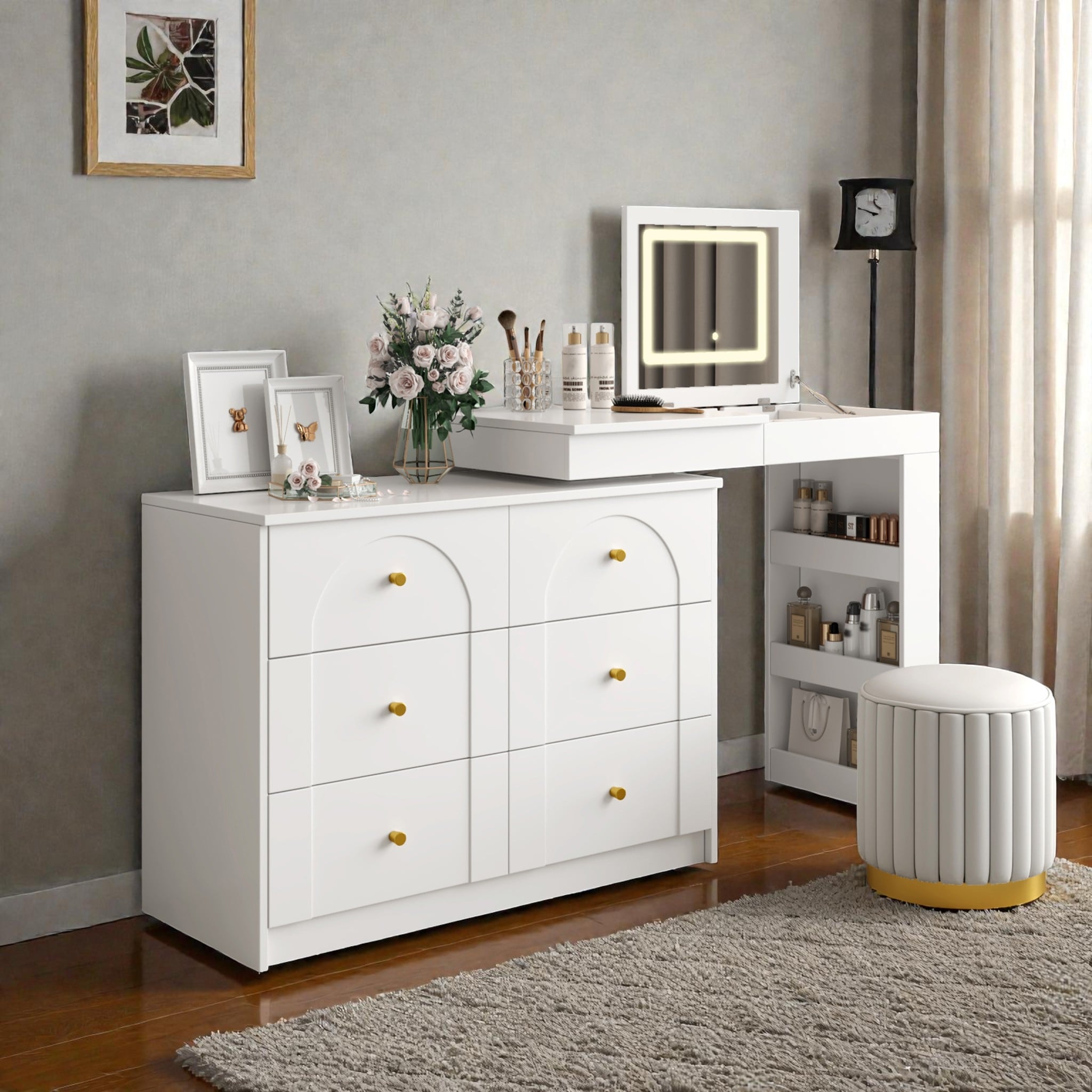 Modern Corner Makeup Vanity Desk with Stool, Charging Ports, Glass Tabletop, Removable Side Cabinet, Drawer & Storage Shelves