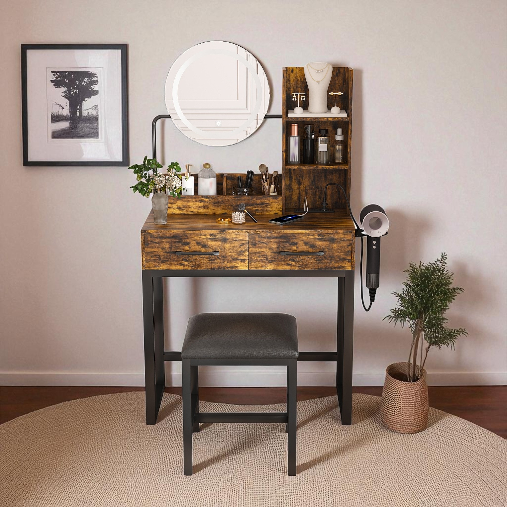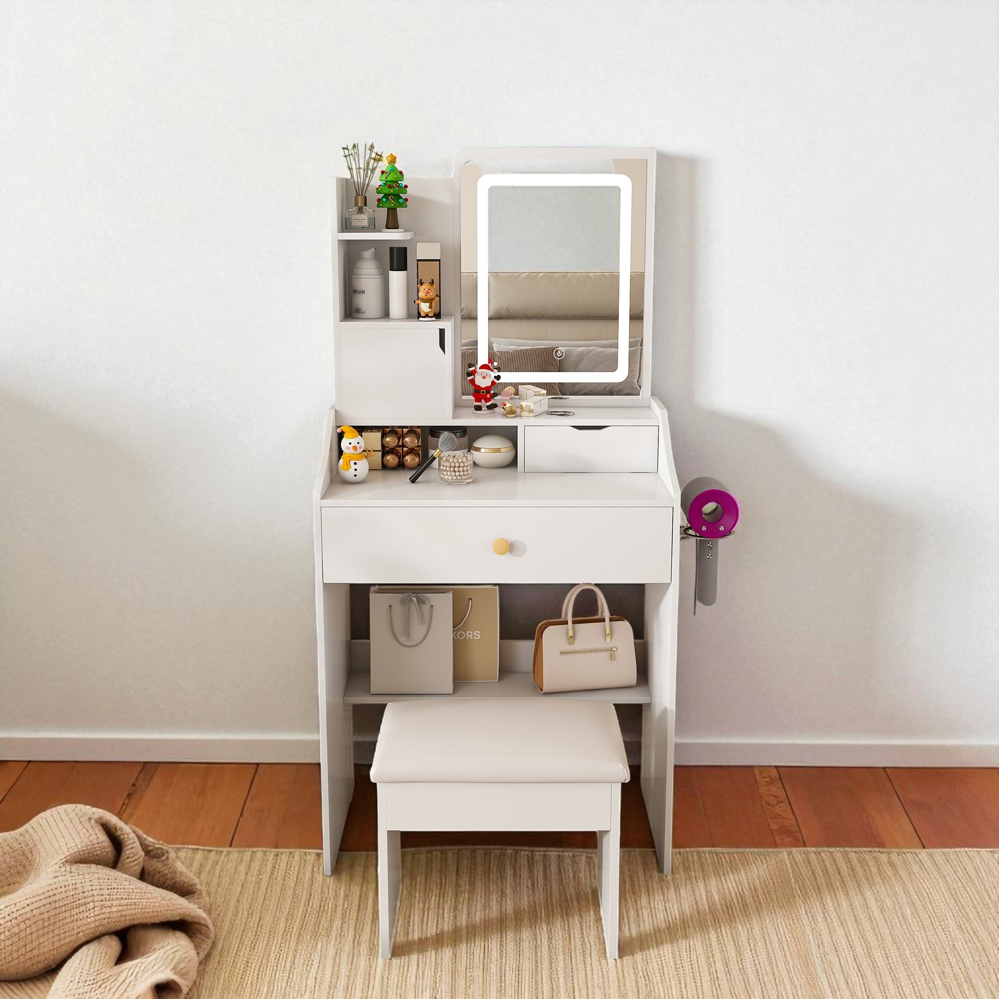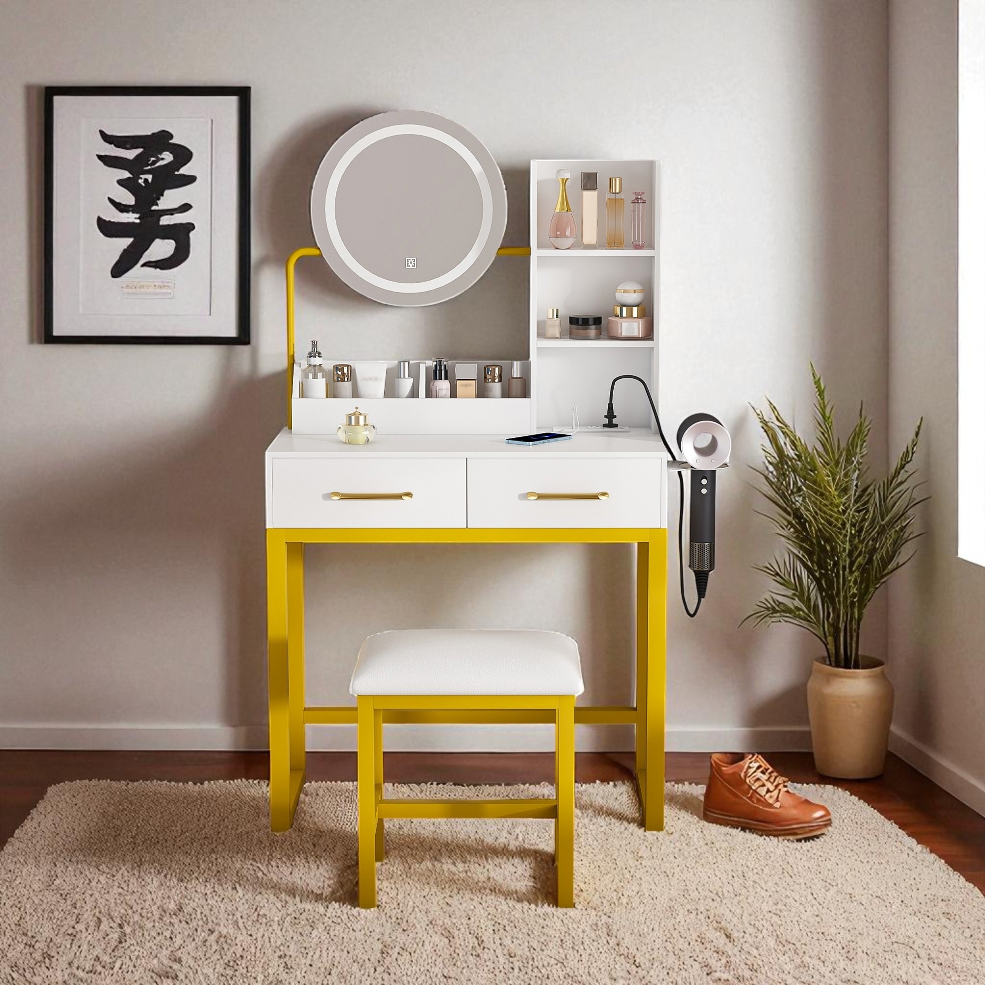 Modern Vanity Set with Touch LED Mirror, Built-in 2 AC Outlets, USB & Type-C Charging, Stool Included, Makeup Storage Desk