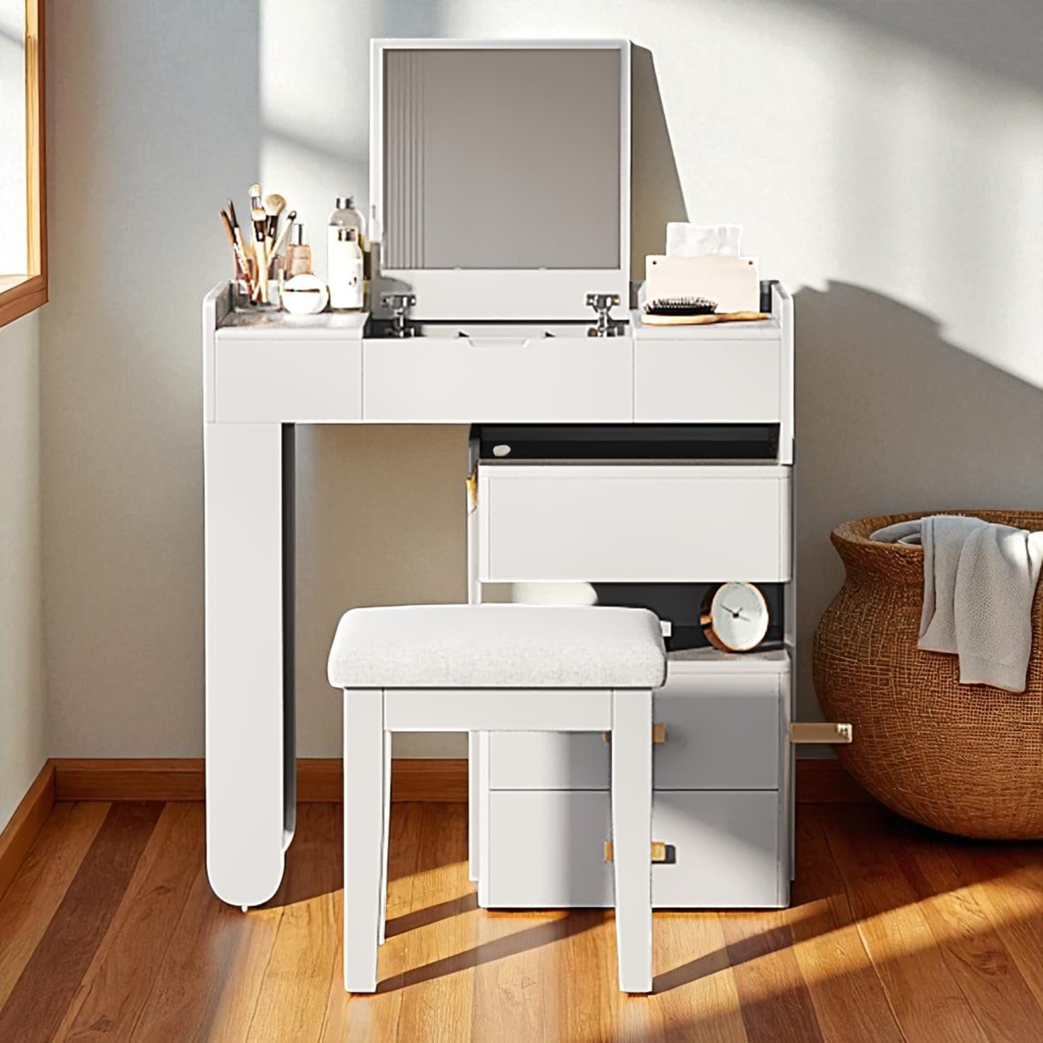 3-in-1 Makeup Vanity Desk with Flip-Top LED Mirror, Retractable Side Cabinet, Storage Drawers & Stool