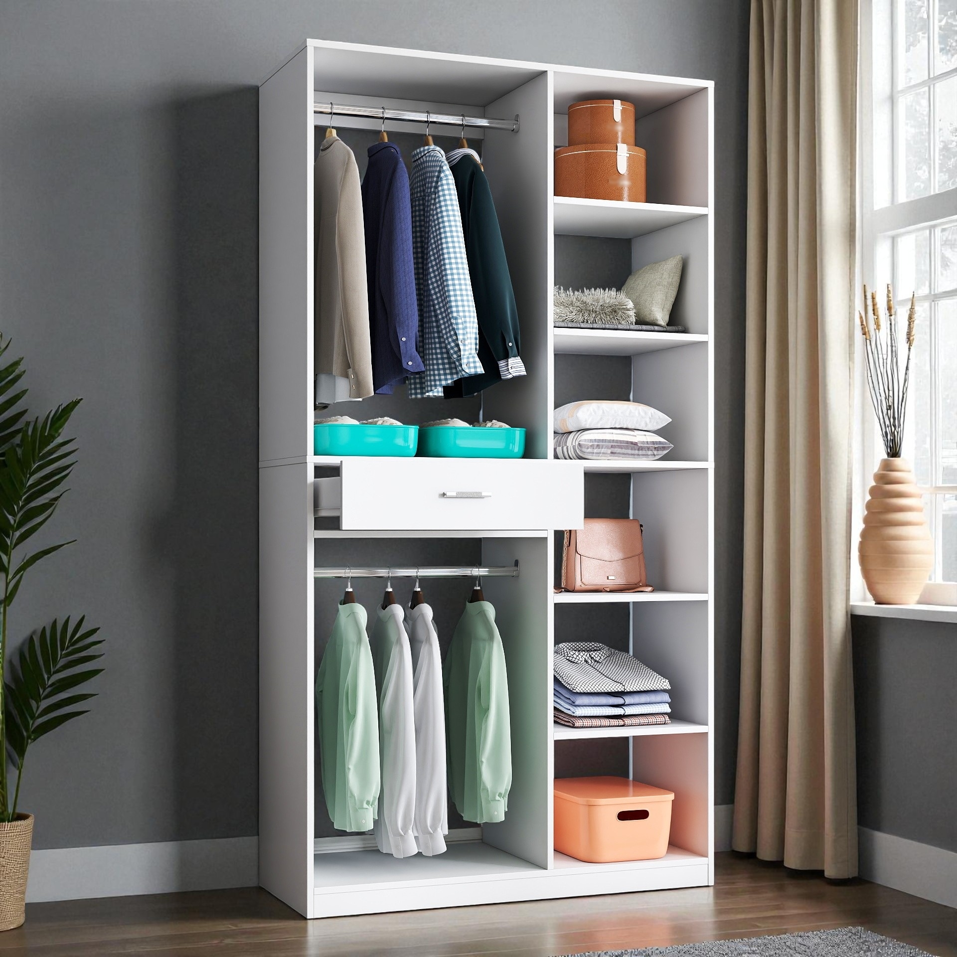 Freestanding Closet System Stand-Alone Wardrobe with 6 Open Shelves 1 Drawer and 2 Hanging Rods 74.8" Wood Closet Organizer