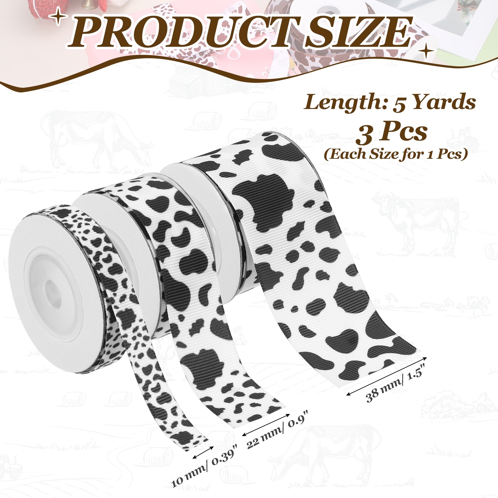 Cow Print Ribbon Set, Grosgrain Animal Print Width Western Farmhouse Ribbon for Gift Wrapping, Party Decorations, DIY Crafts