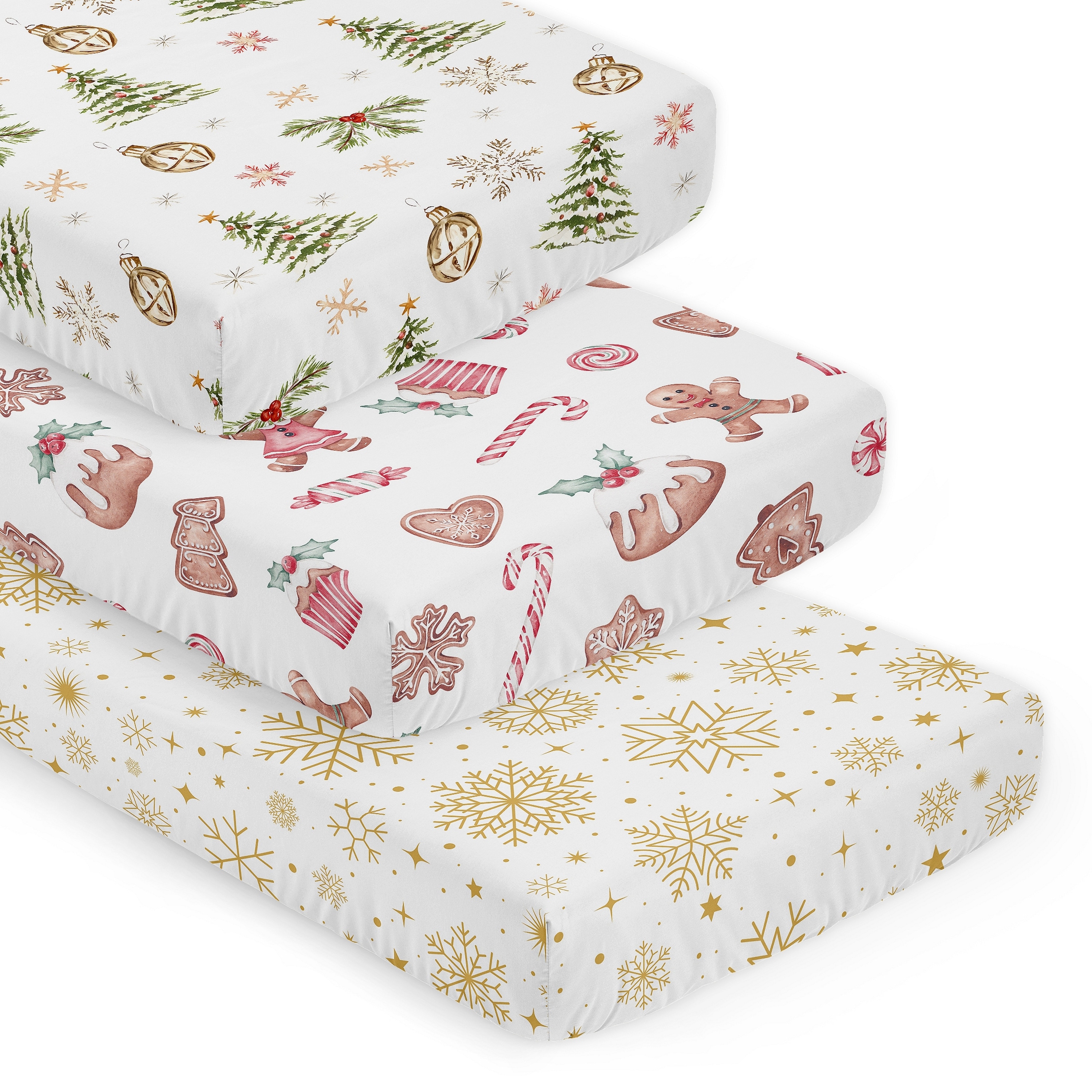 Sweet Jojo Designs Christmas Holiday Boy, Girl, Unisex/Gender Neutral 3 Pack Fitted Crib Sheets - Gingerbread, Snowflakes, Trees