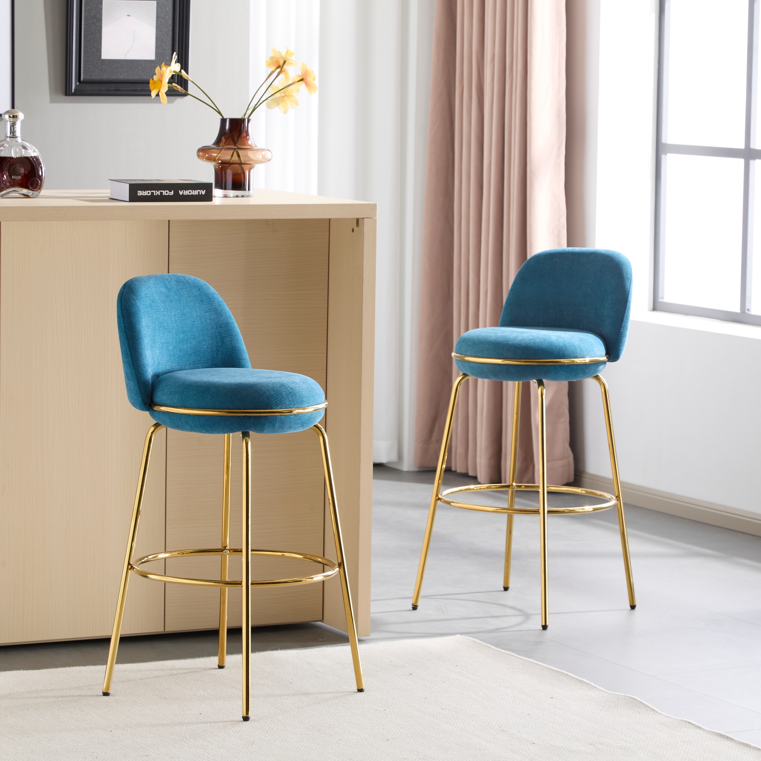 Chic Bar Stools Set of 2 Blue Fabric Upholstered Accent Chairs with Low-profile Back, Metal Frame and Integrated Footrest