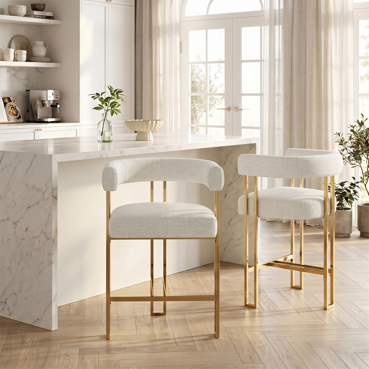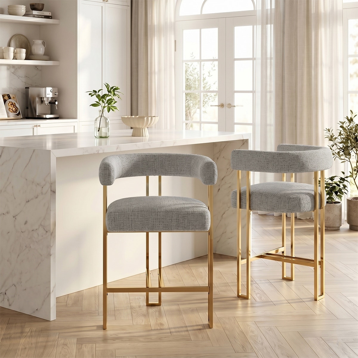 Chenille Upholstered Counter Stools with Gold Metal Legs (Set of 2)