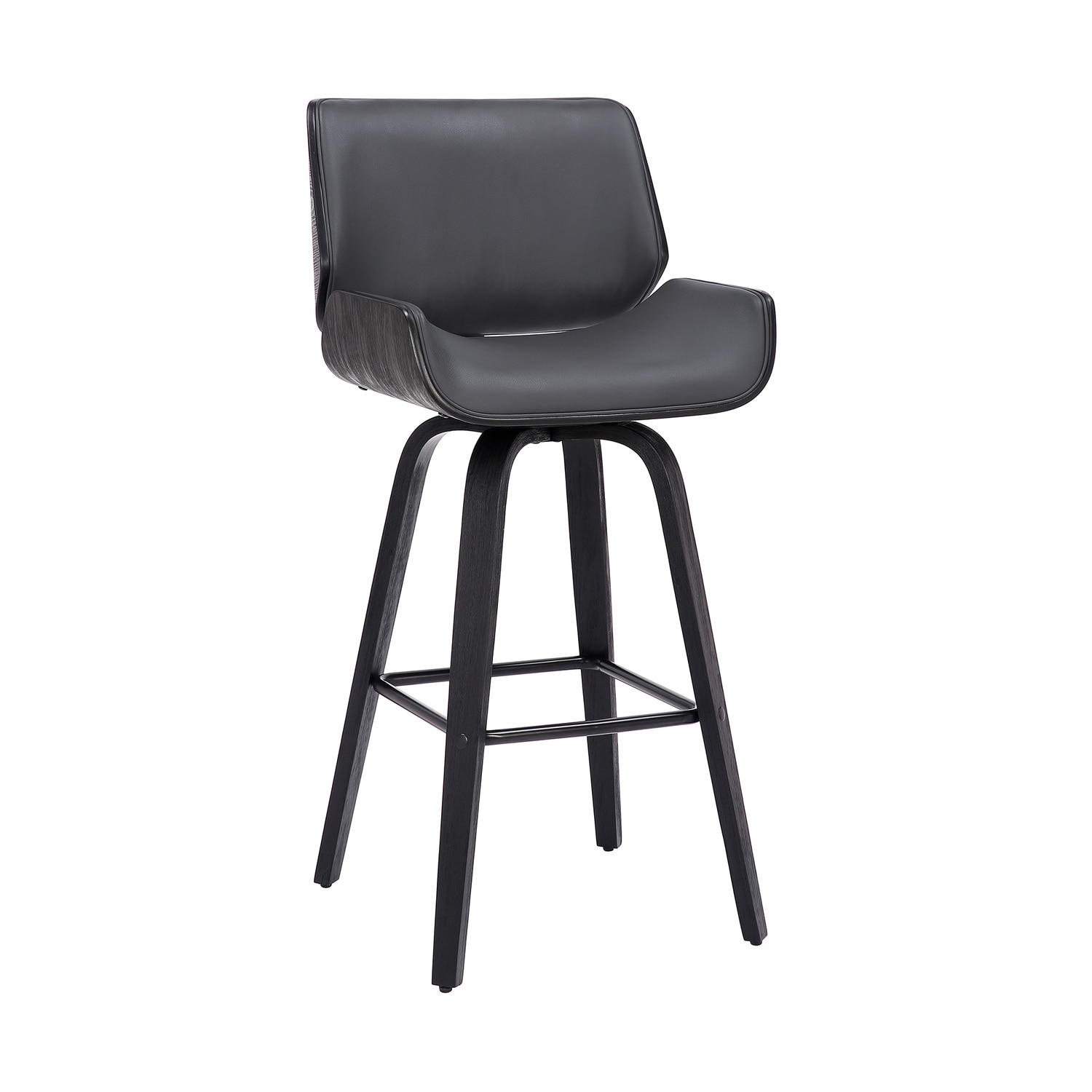 26 Inch Swivel Bar Stool with Black Wood Frame and Grey Faux Leather Upholstered Seat, Kitchen Counter Height Stool