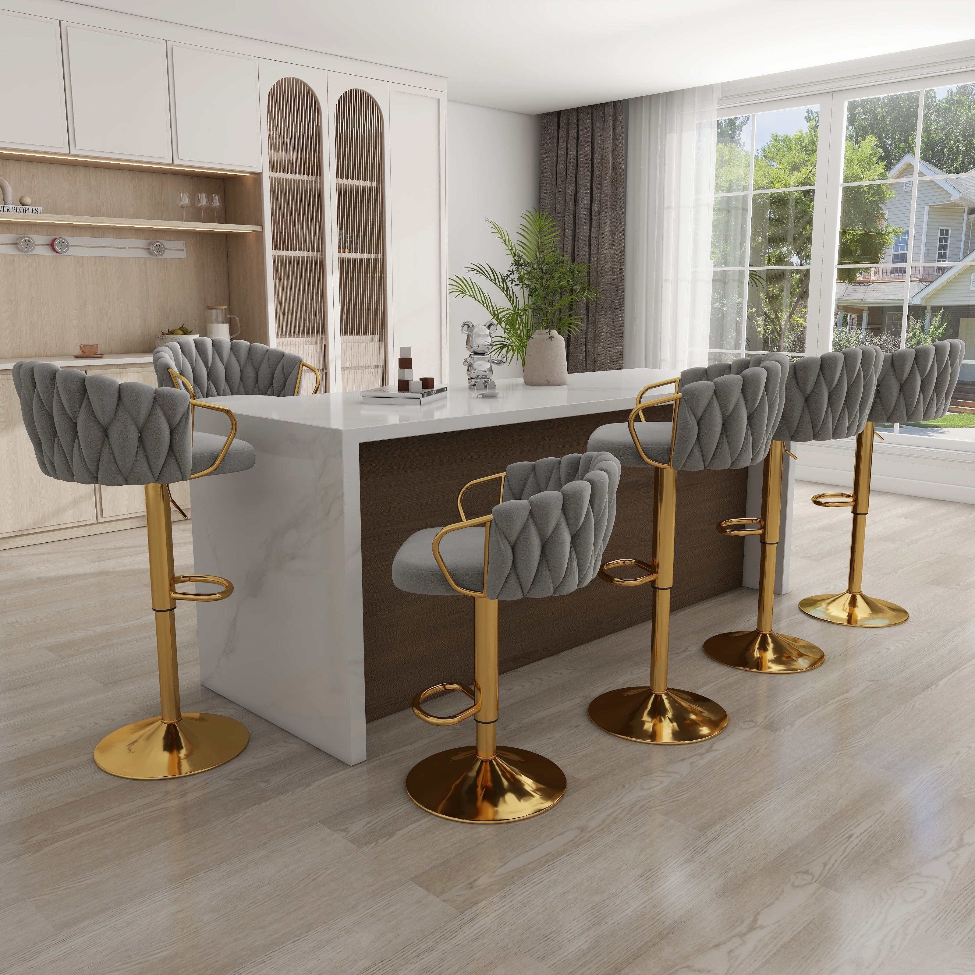 Set of 4 Bar Stool Adjustable Height Swivel Velvet Woven