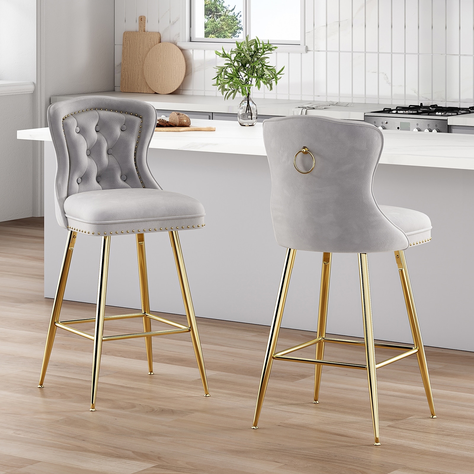Counter Height Bar Stools Set of 2, Velvet Upholstered Wingback Barstools with Nailhead Accents and Button Tufted Backrest
