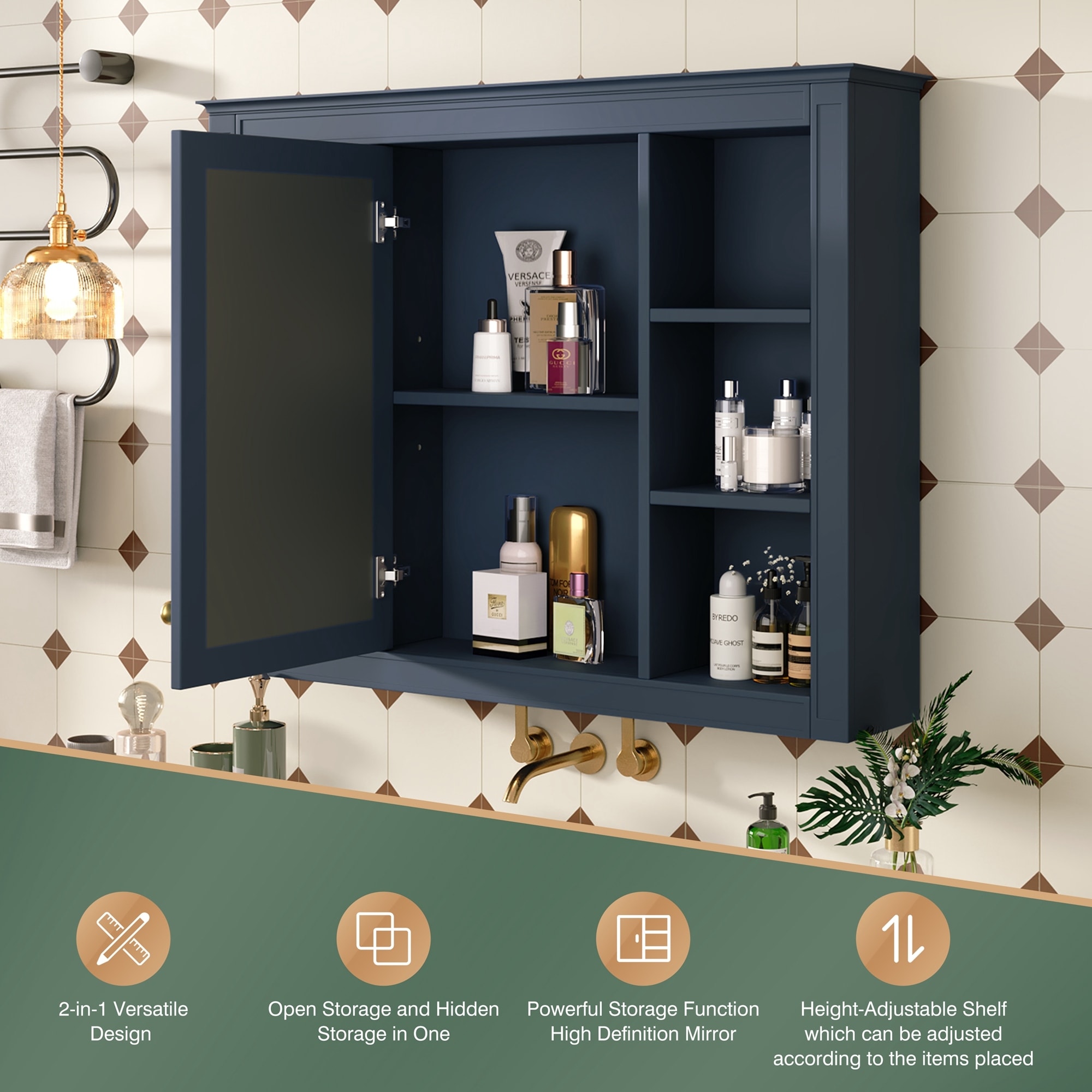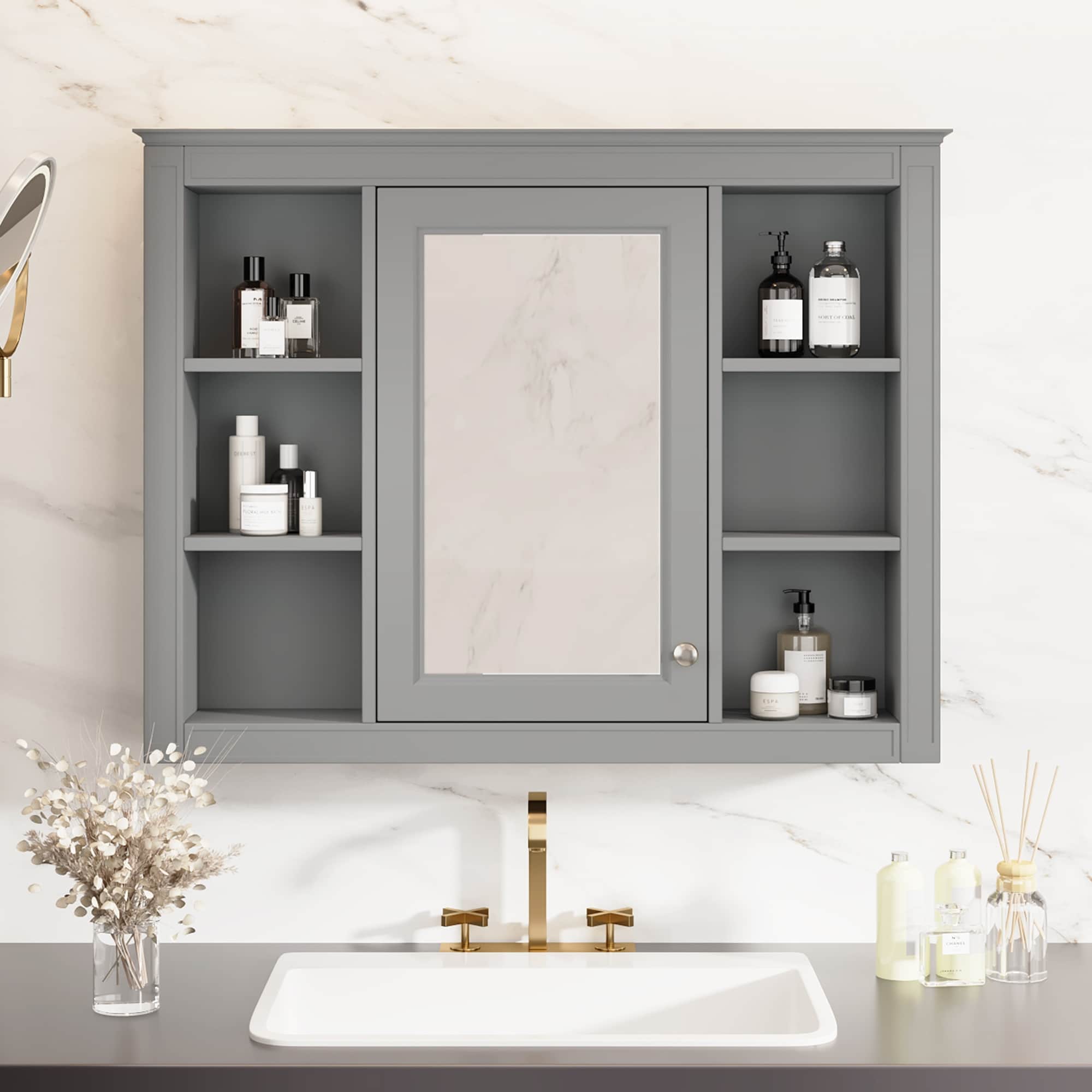 36''H Wall-Mount Bathroom Medicine Cabinet, Recessed or Surface Installation With Adjustable Glass Shelves