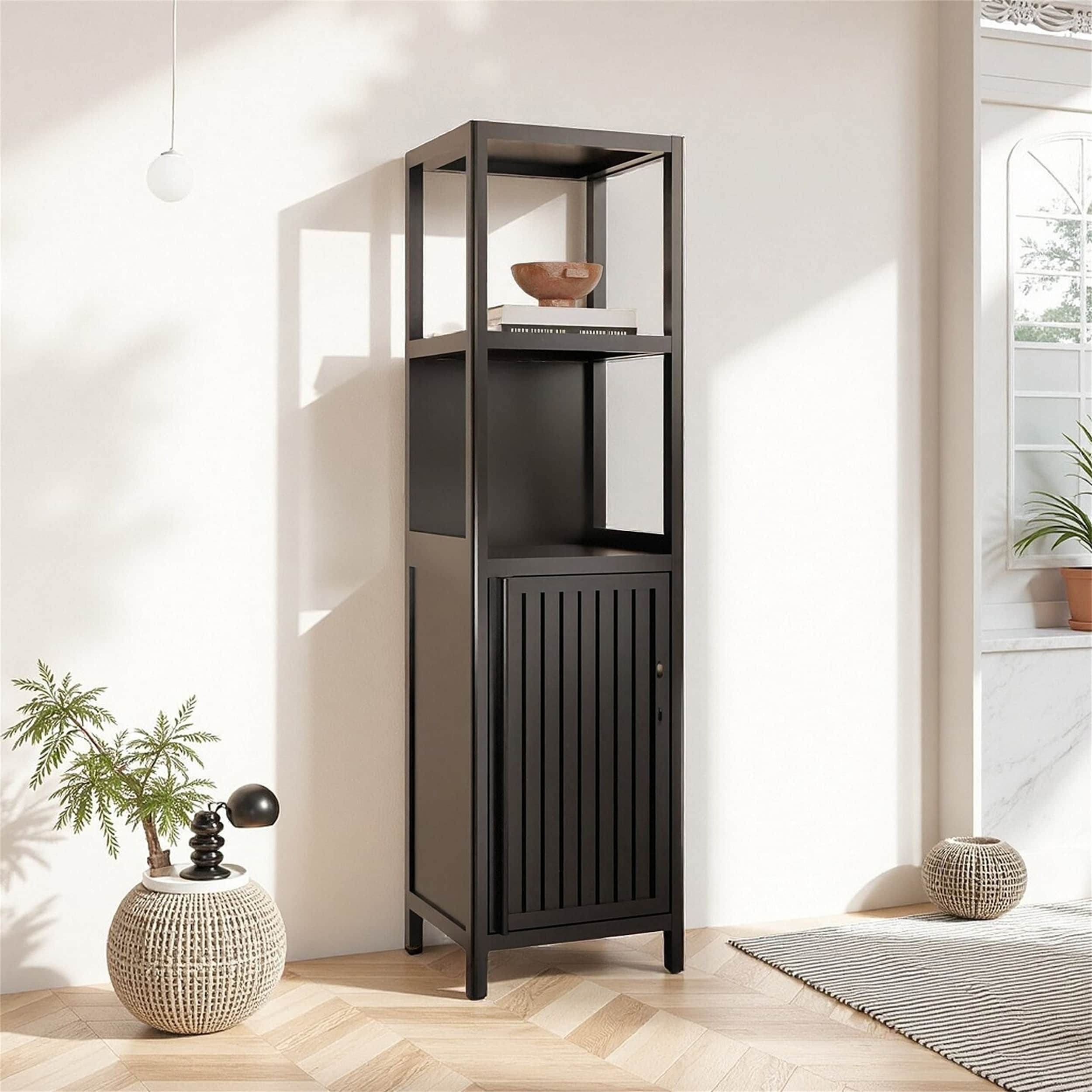 Natural Bamboo Tower Cabinet with 2 Open Shelves and Closed Storage