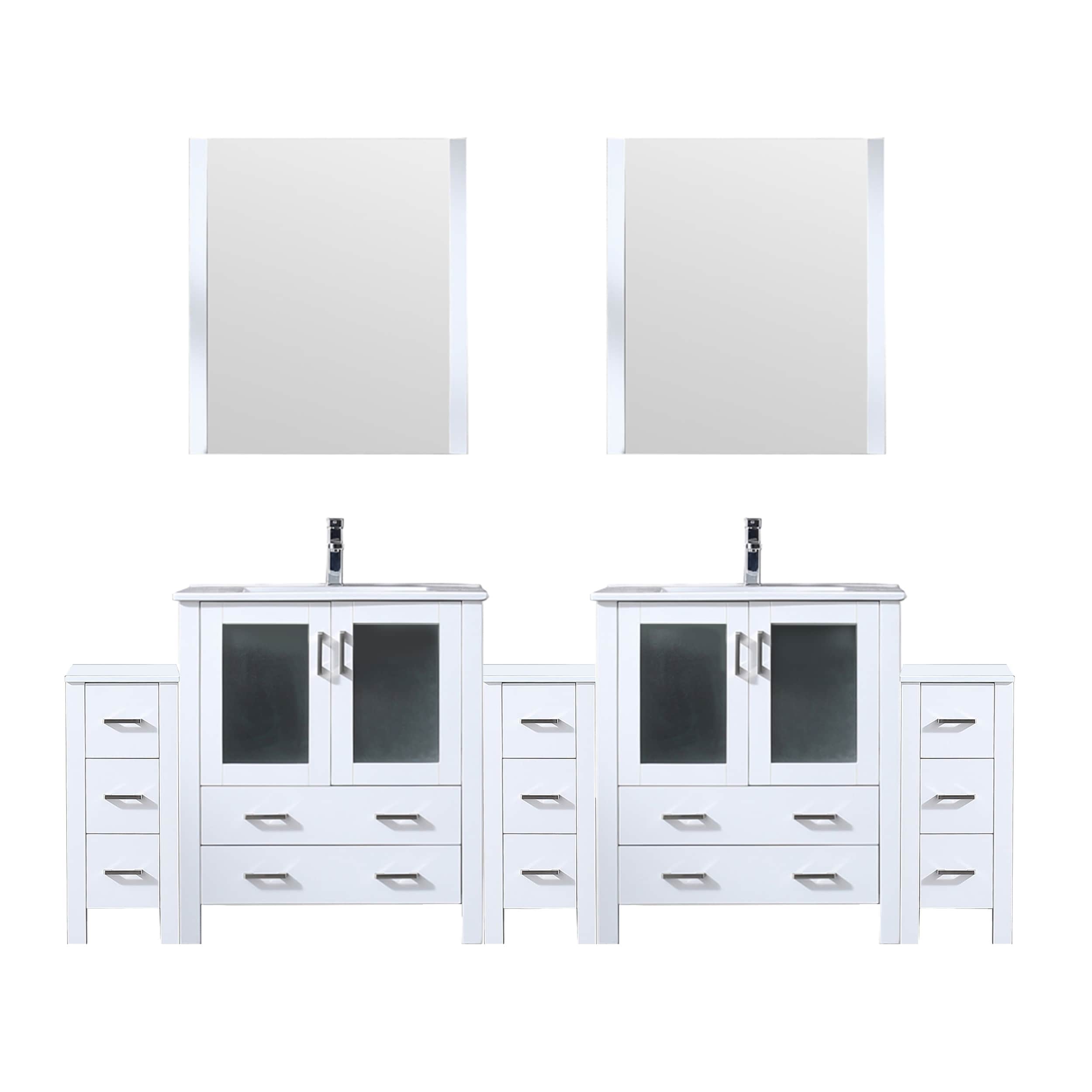 White Double Bath Vanity 96 in. W x 18.25 in. D, with Side Cabinets, White Ceramic Top, 28 in. Mirrors, and Faucet Set