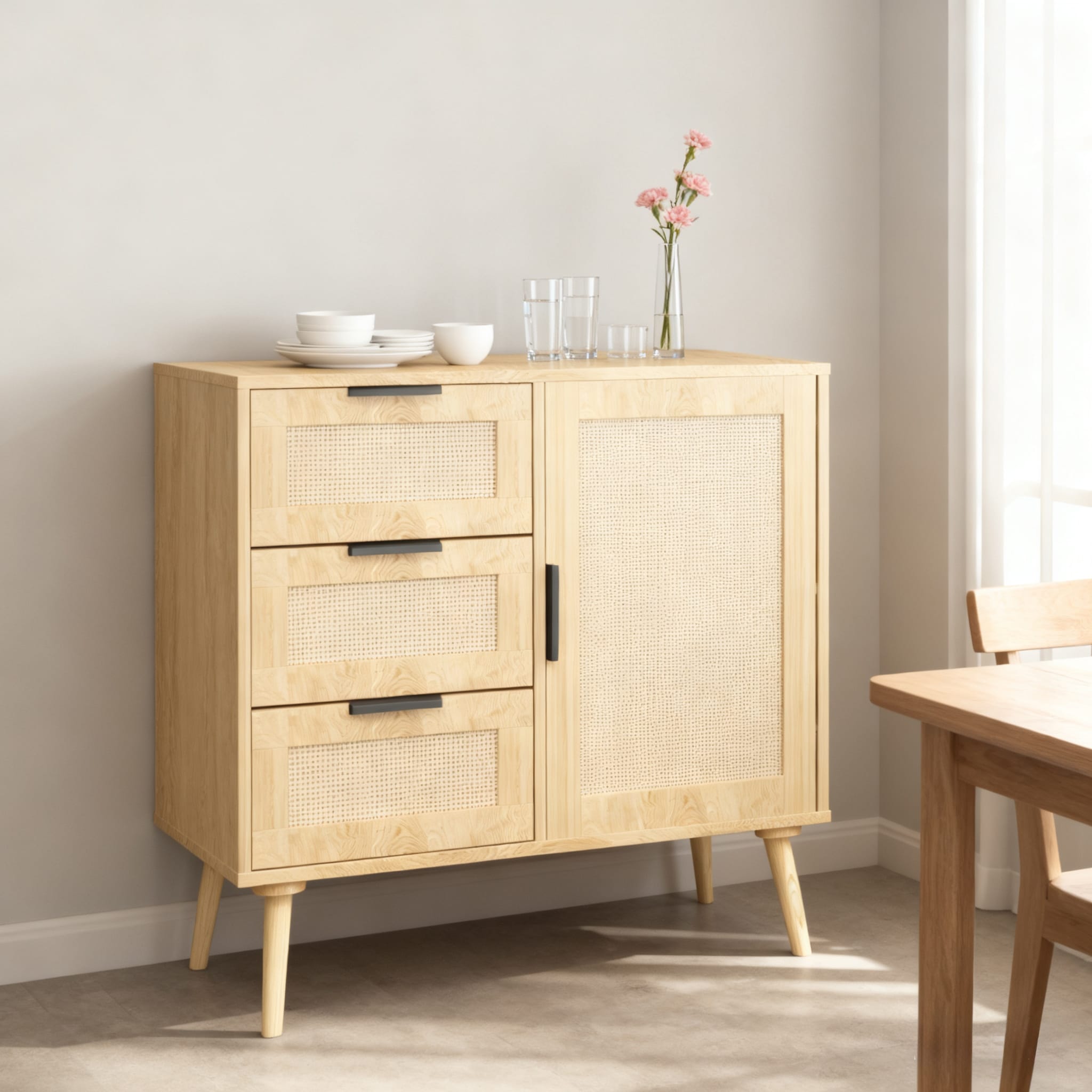 Buffet Cabinet with 3 Rattan Drawers & Door, 30.7"H Light Wood Accent Cabinet